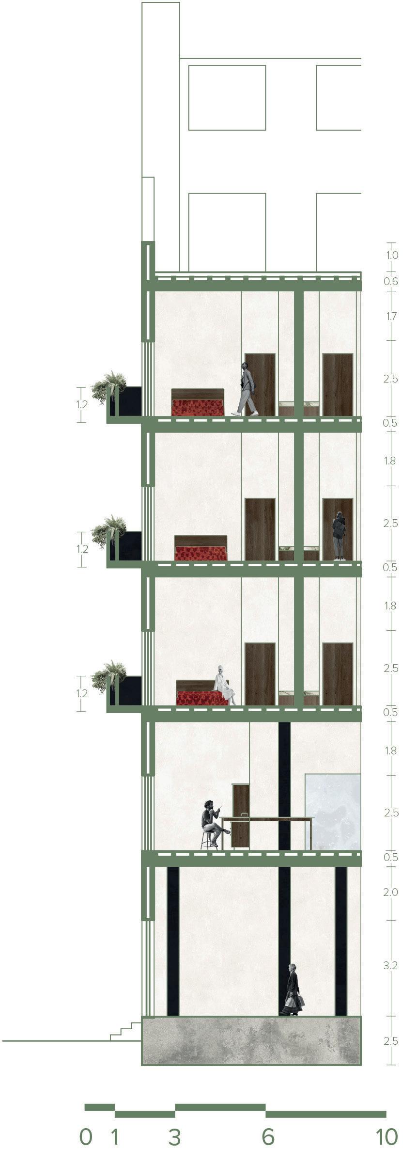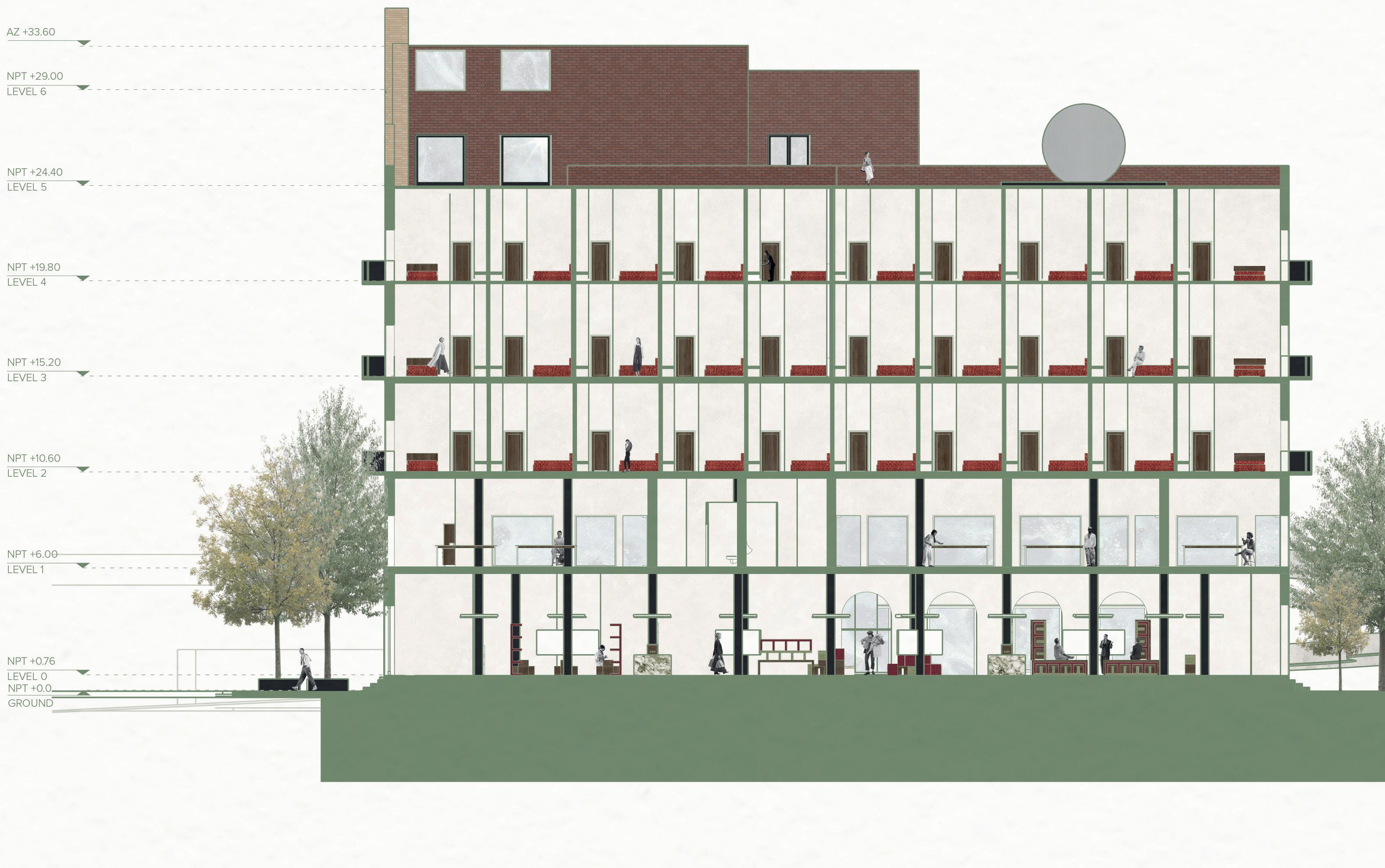 THE PRIVATE AND CONTROLLED ACCESS FOR THE PERMANENT AND TEMPORARY RESIDENT. THIS ARTERY GUARANTEES THE PRIVACY OF THE APARTMENTS, CO-LIVING AND HOTEL ROOMS. THE FLOW HERE IS A REMINDER OF THE RIGHT TO HOUSING AND THE ECONOMIC BALANCE THAT SUSTAINS THE ECOSYSTEM. THE RESIDENT ANCHORS TO THE SITE, USING THE CENTRAL NEXUS AS AN EXTENSION OF THEIR OWN HOME.