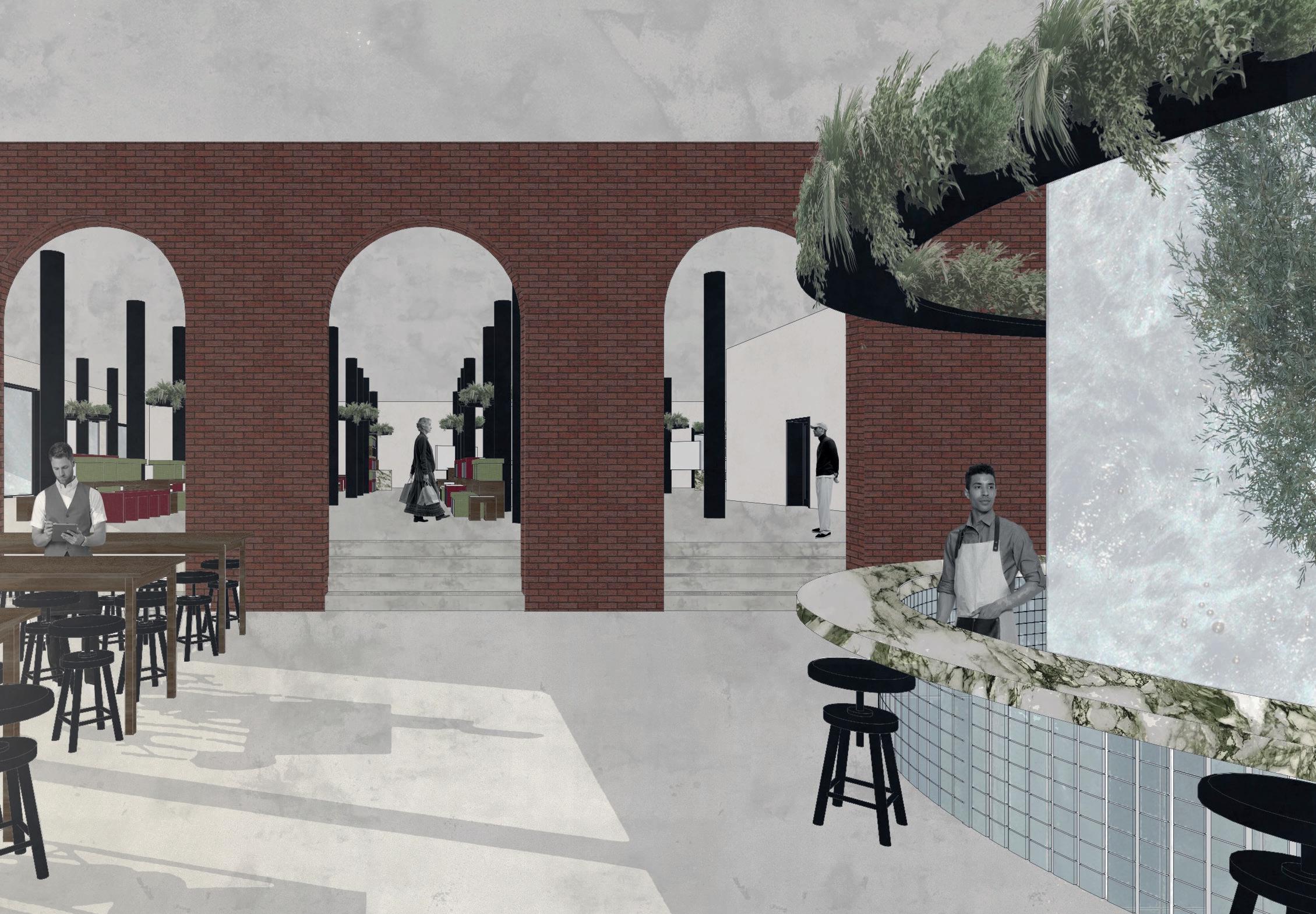 STRATEGICALLY LOCATED BETWEEN THE CINEMA AND THE AMPHITHEATER, THIS ZONE IS DESIGNED TO ACT AS AN ALTERNATIVE WAITING AREA. THE LARGE SPACE IS INTENTIONALLY DESIGNED TO ACCOMMODATE HIGH CAPACITY WHILE PEOPLE WAIT FOR EVENTS TO BEGIN IN EITHER VENUE. IT SERVICES THE SNACKING NEEDS OF BOTH FORUMS, PROVIDING RETAIL SPACE FOR LOCAL VENDORS FOCUSING ON HEALTHY AND CONVENIENT SNACK OPTIONS. BY OFFERING THESE BALANCED CHOICES, THE SPACE ALIGNS WITH THE ATLR HUB’S EMPHASIS ON WELLNESS, SUPPORTING THE LARGE PUBLIC FLOW DURING CULTURAL EVENTS.