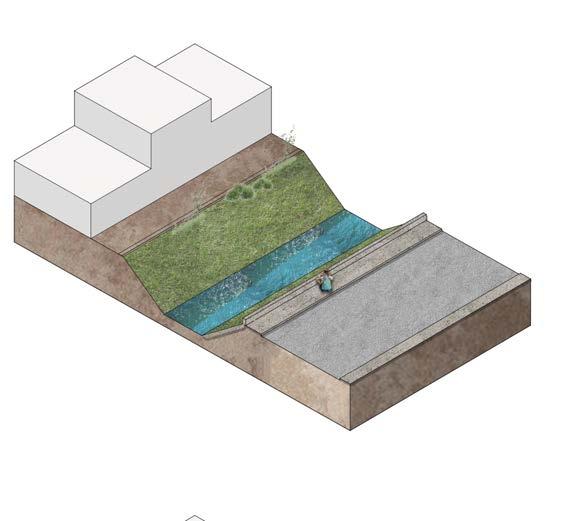 Debido a la falta de espacio verde en la zona, se busca generar un espacio de conexión entre el usuario y agua, generando un parque a la orilla del canal donde dependiendo de la temporada de lluvias o sequía funciona de distintas maneras según el caudal, también se crean espacios de relajación y recreación para toda la comunidad.