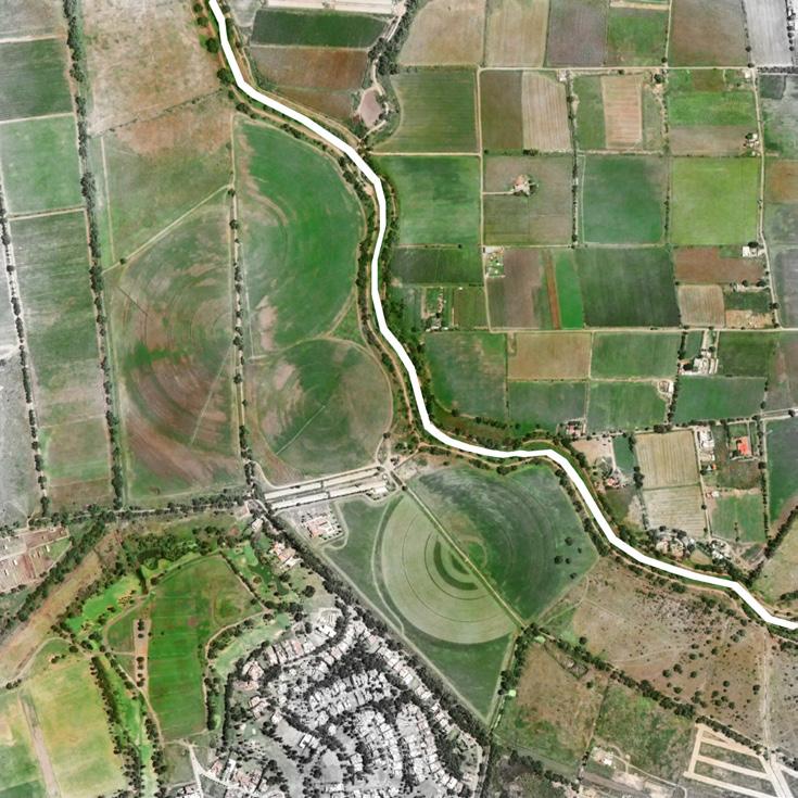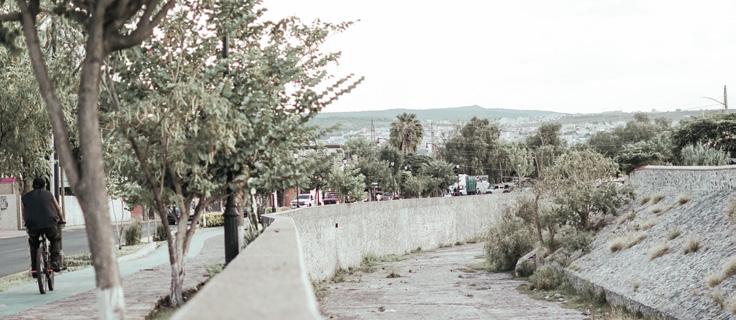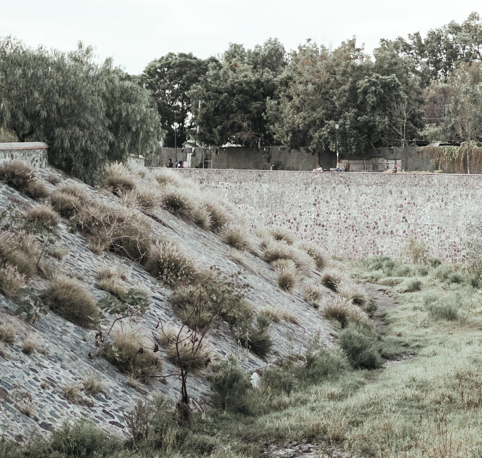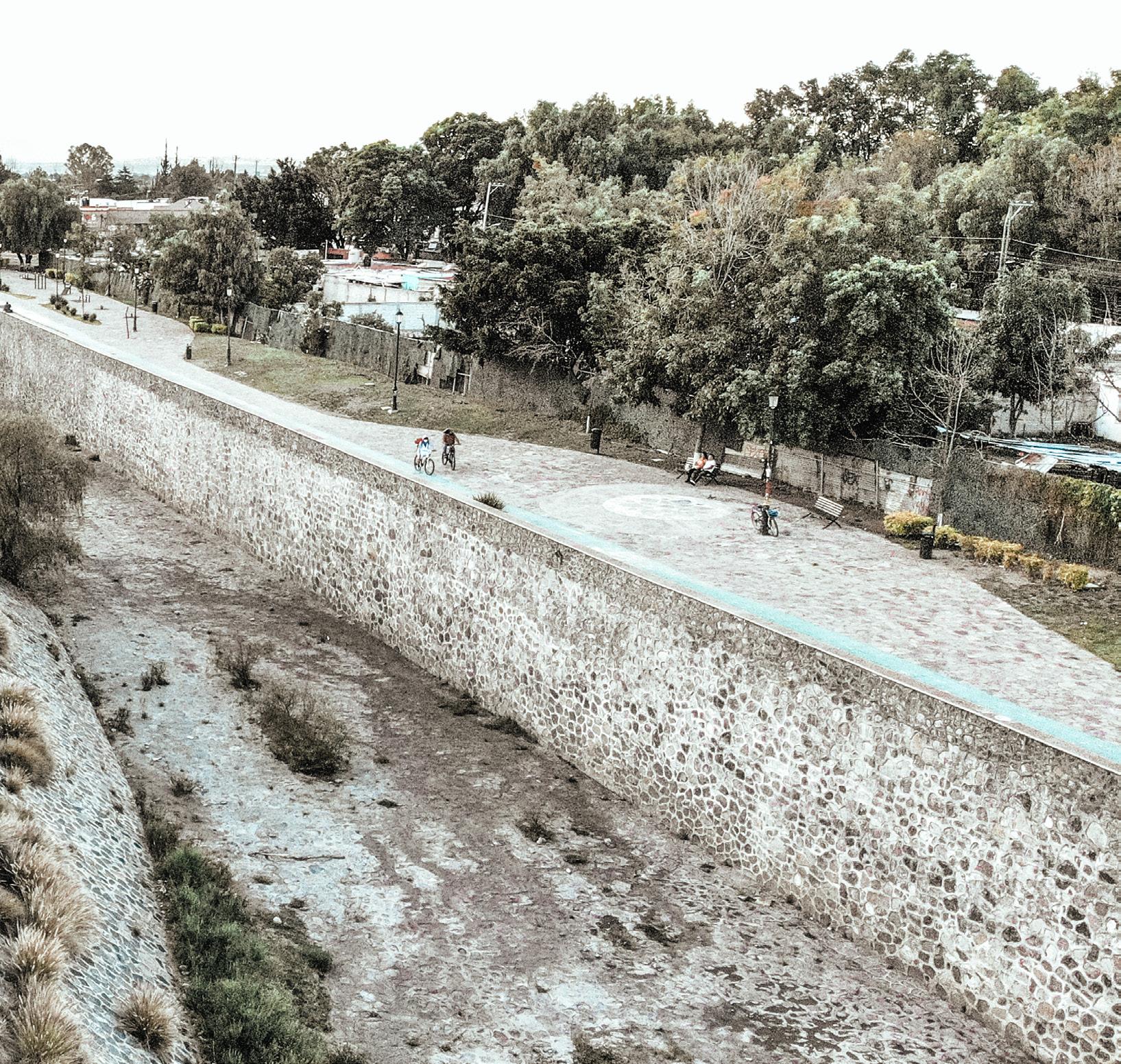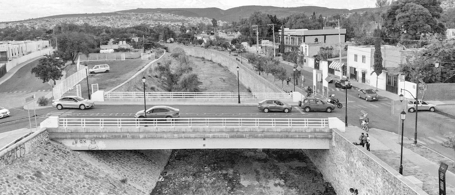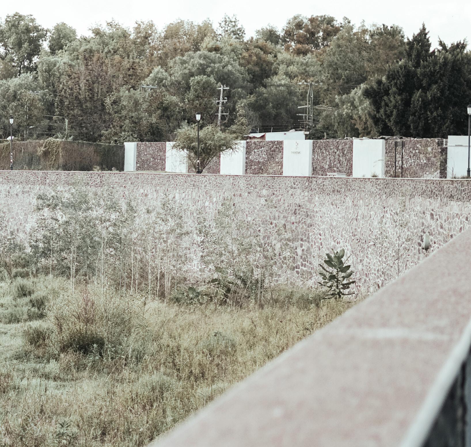 En este tramo del río, los taludes fueron rectificados con muros de mampostería, desde la intersección de Av. Constituyentes hasta el Lienzo Charro