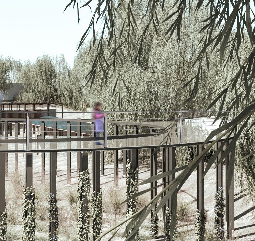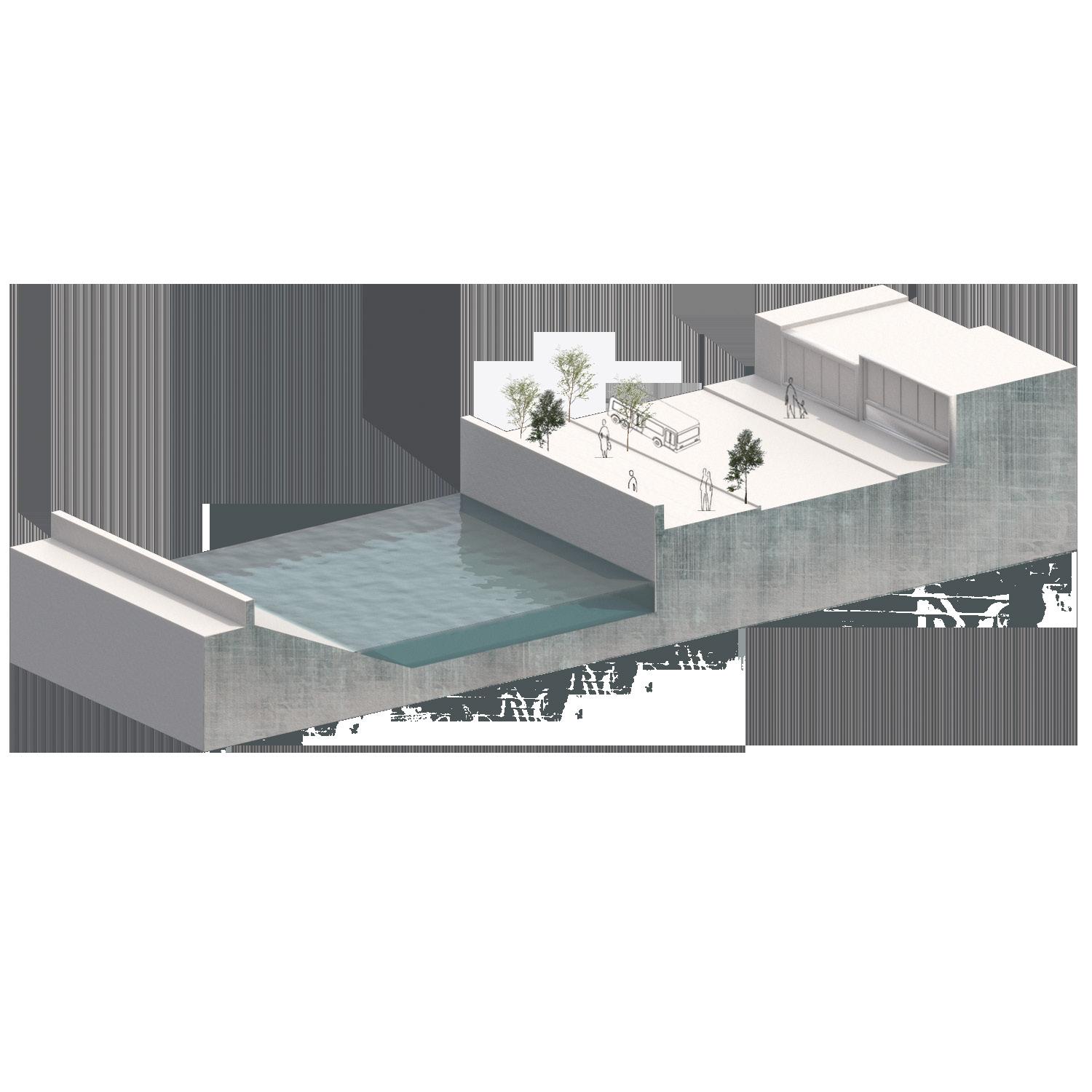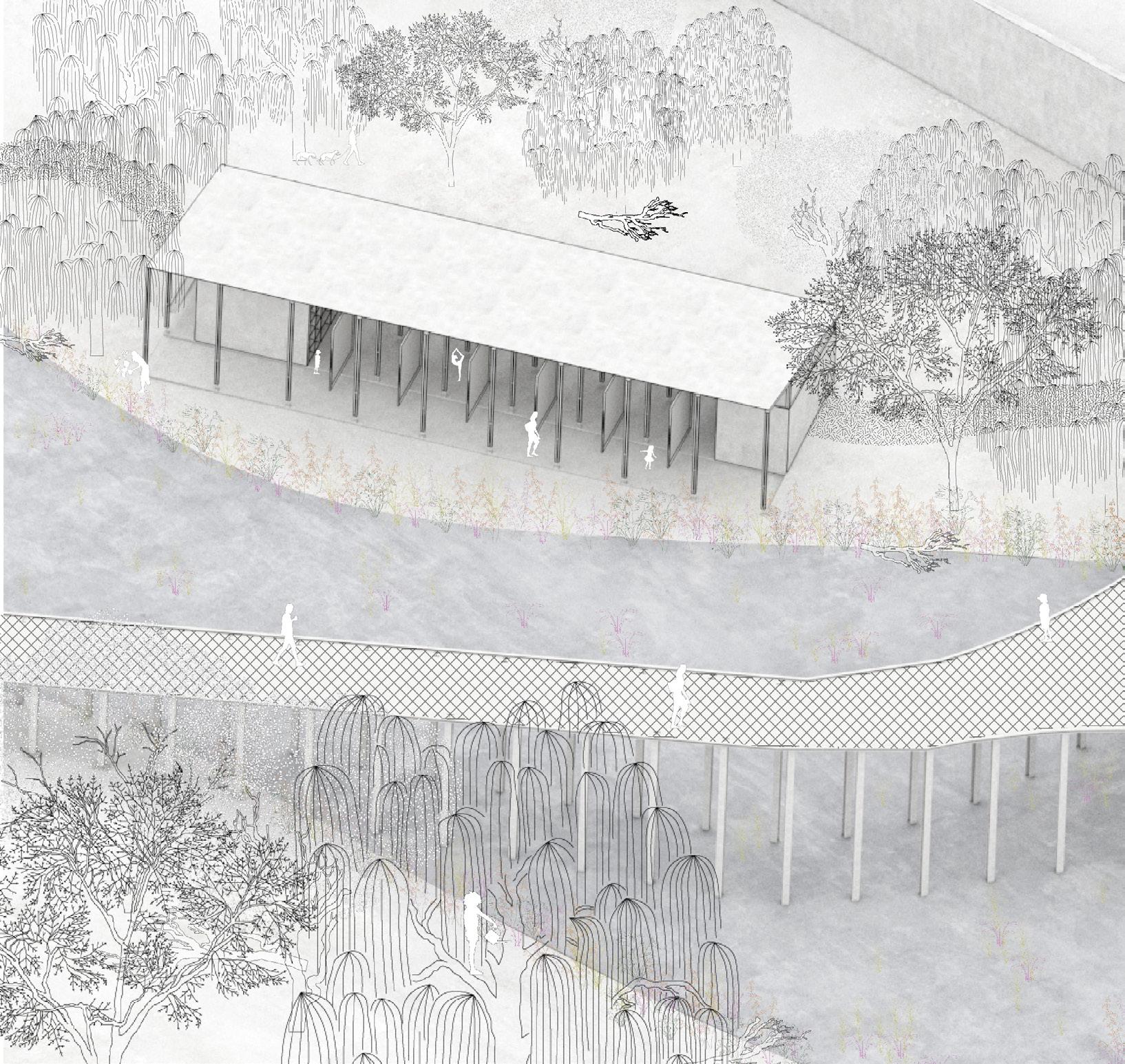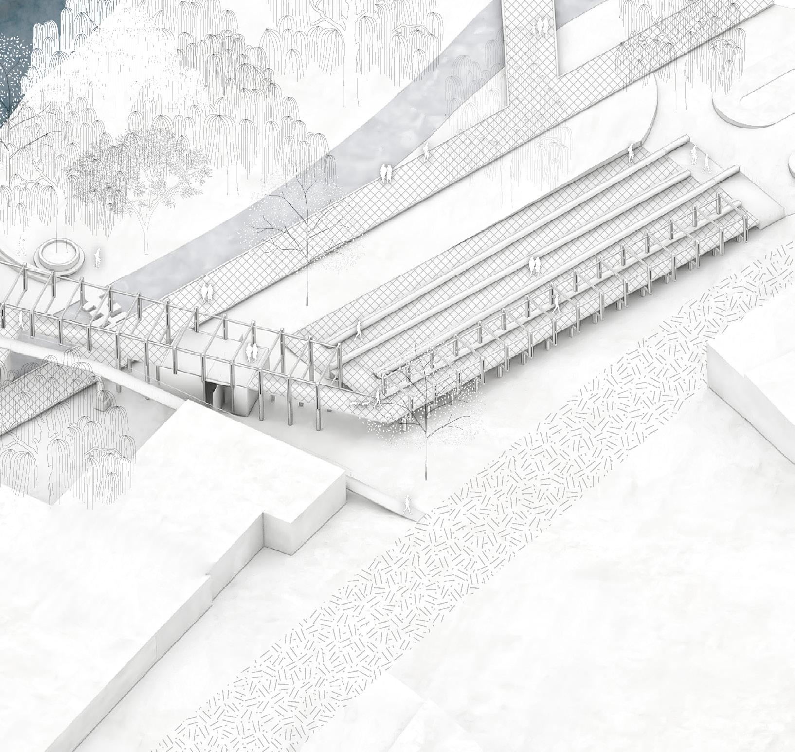 VISTA AXONOMÉTRICA PABELLÓN, COMERCIO Y CAMINO DE REJILLA