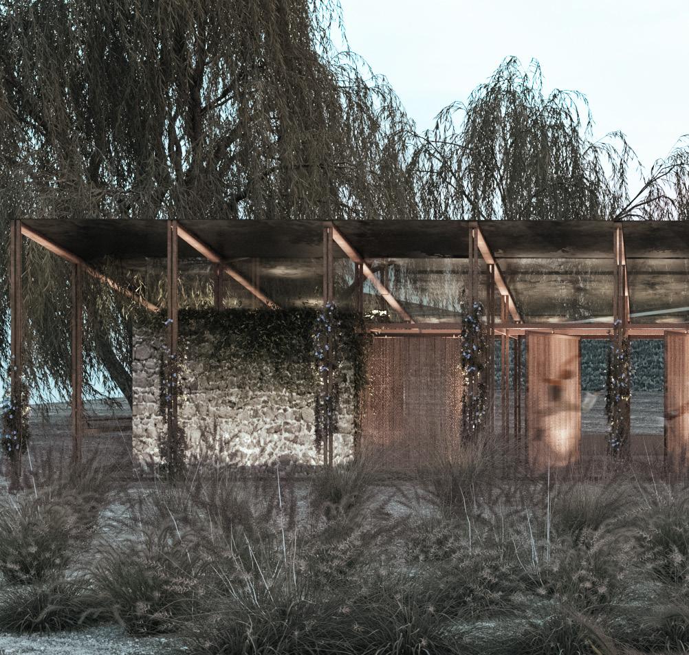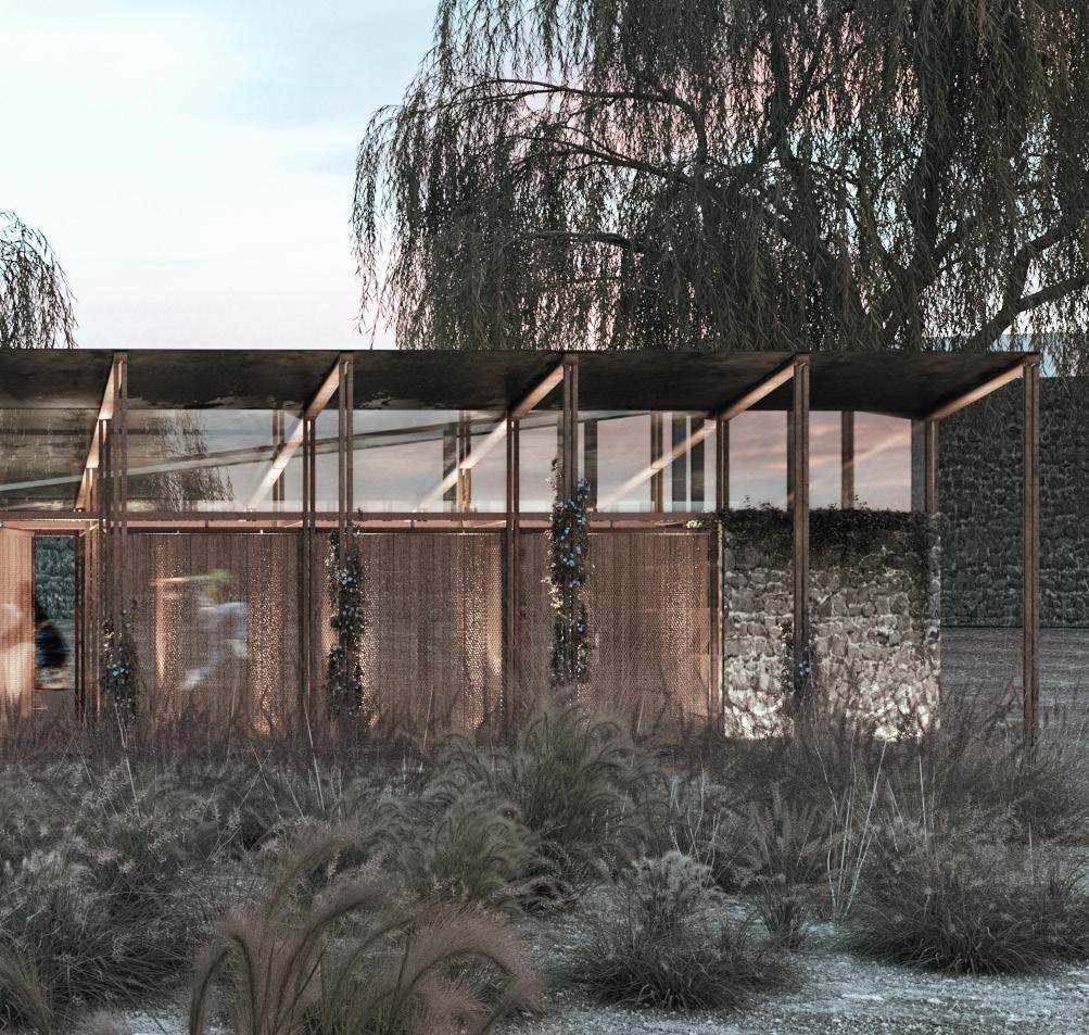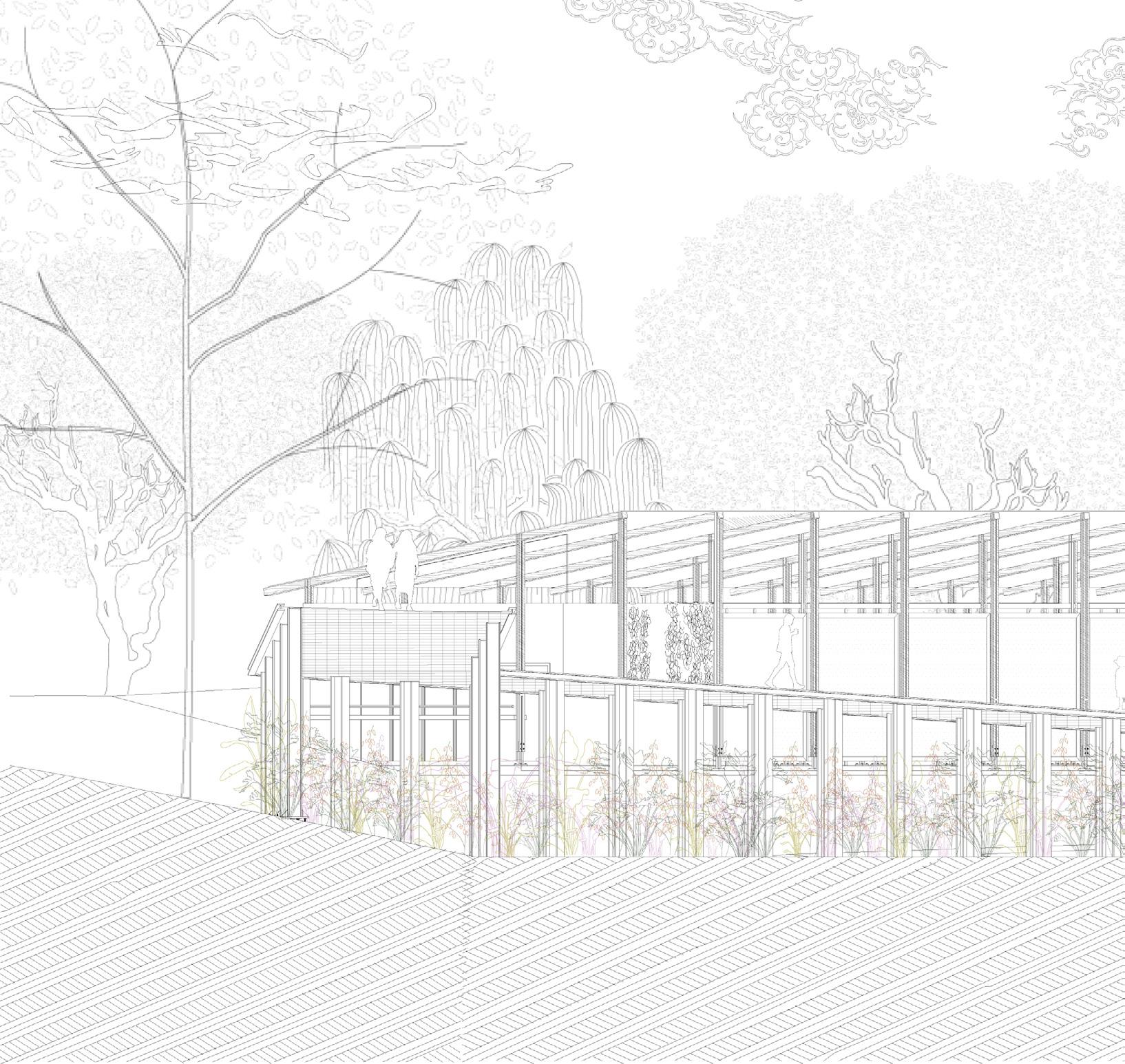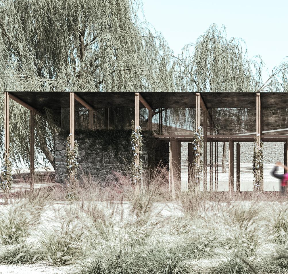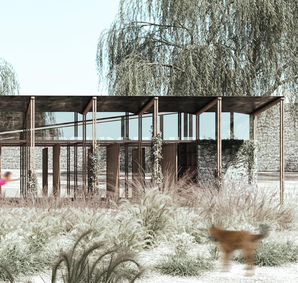 VISTA AXONOMÉTRICA PABELLÓN, COMERCIO Y CAMINO DE REJILLA