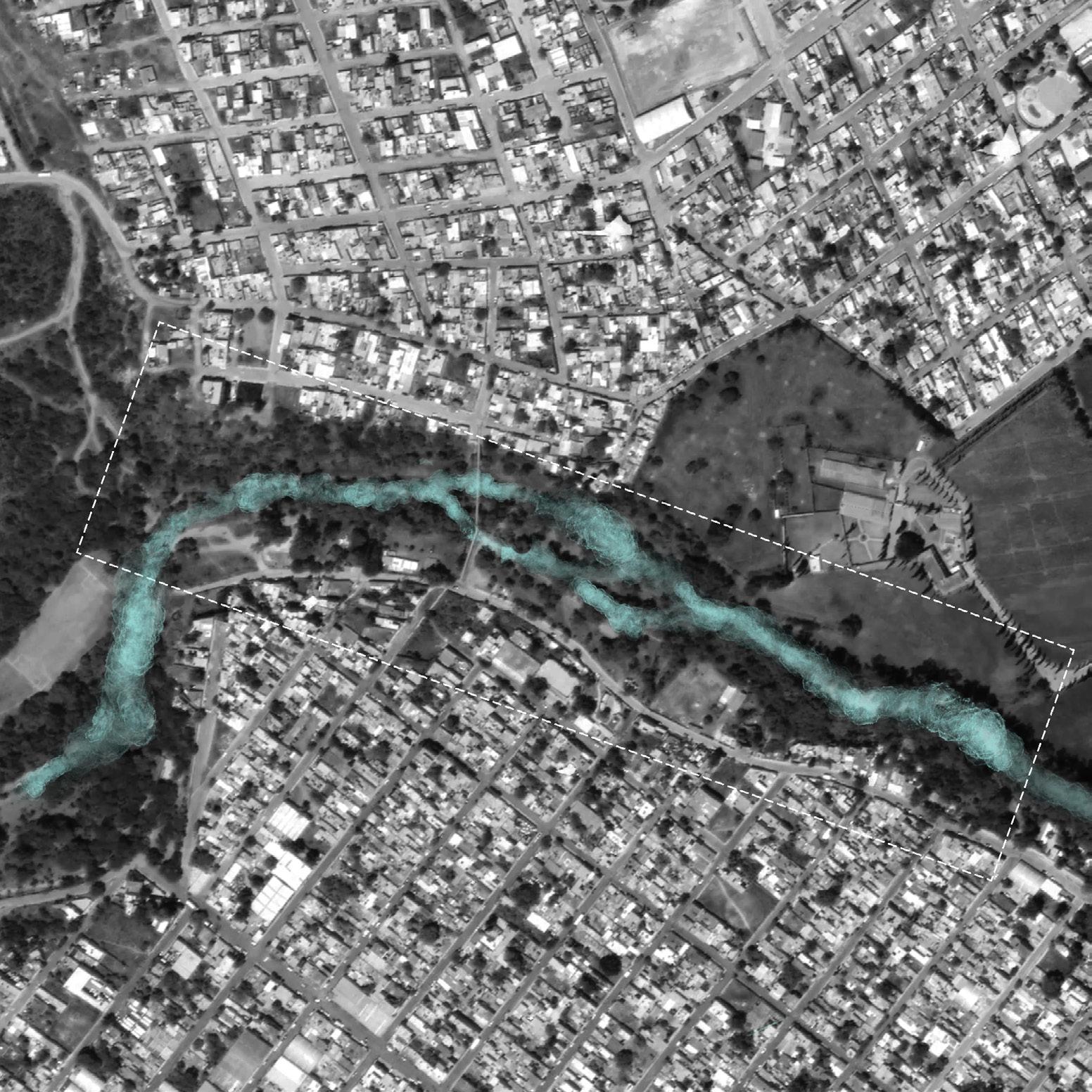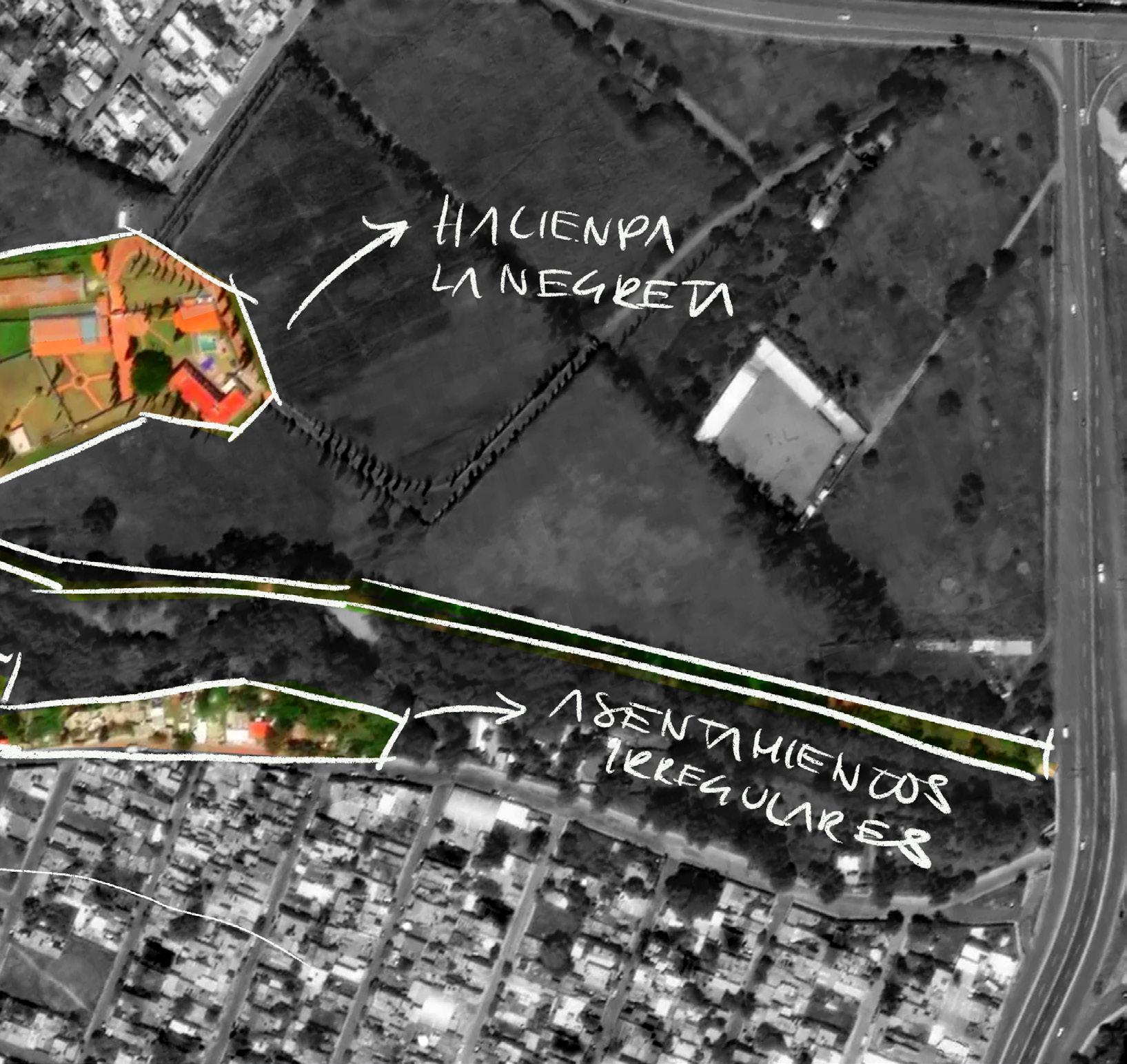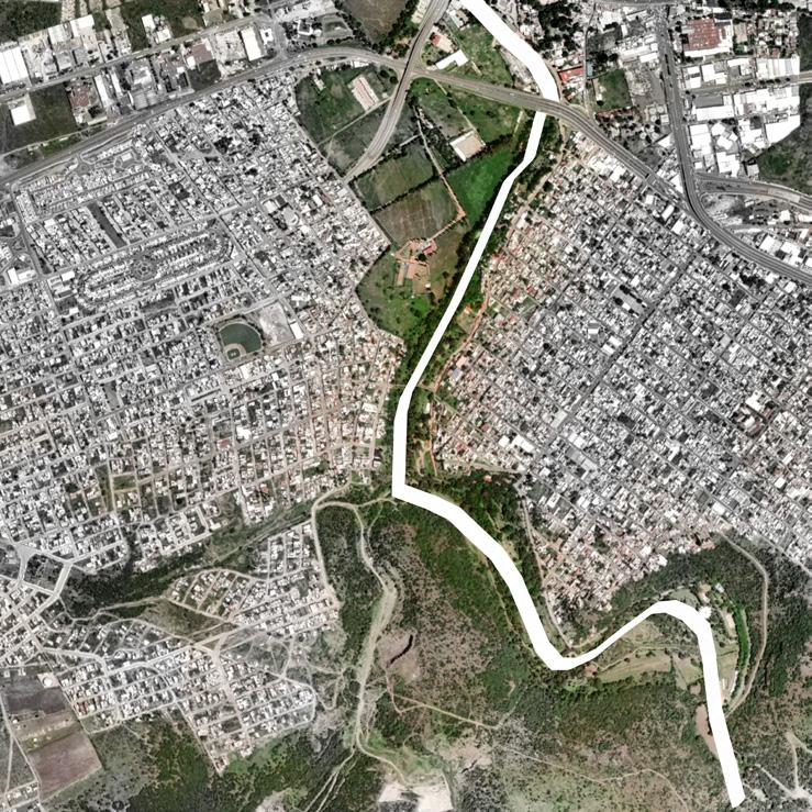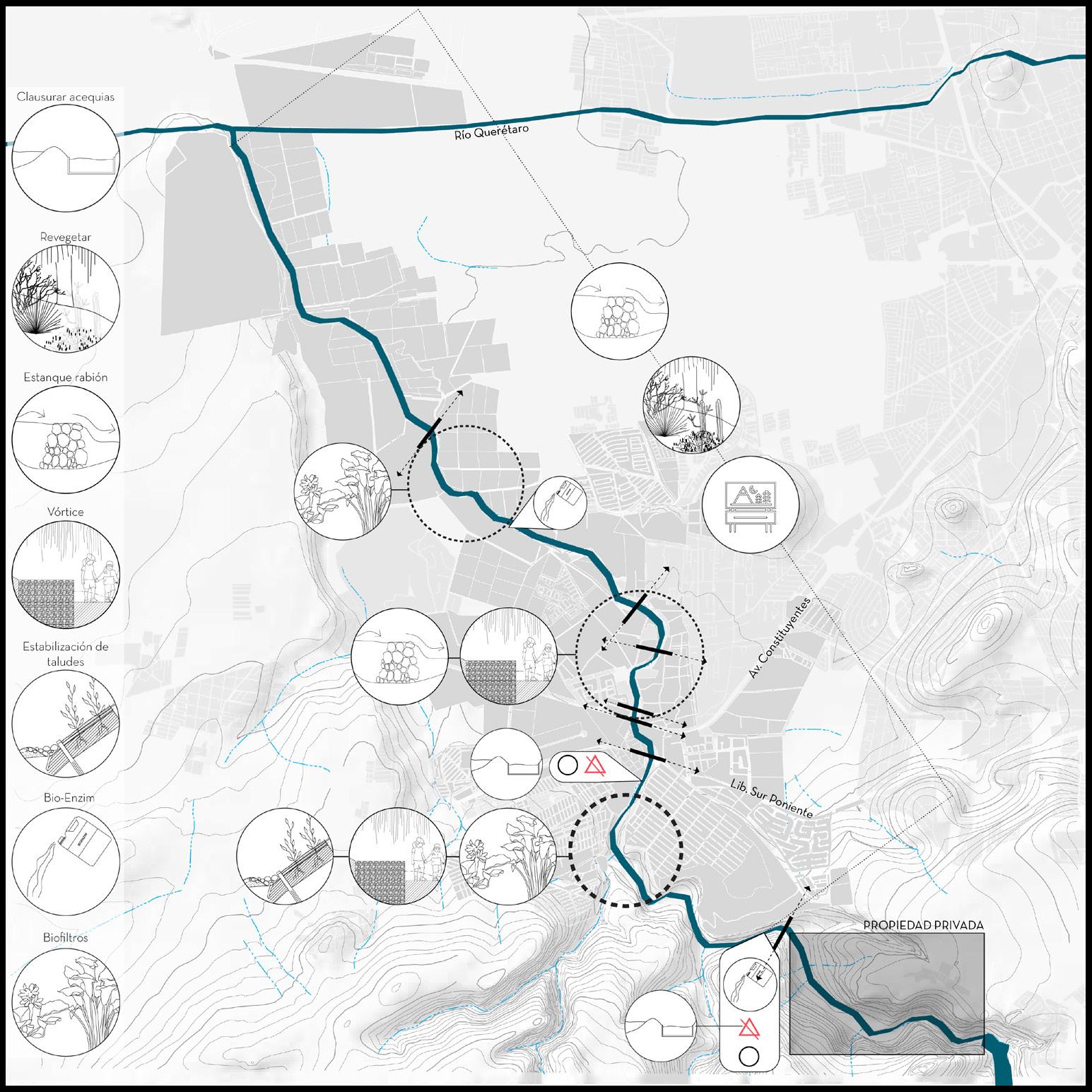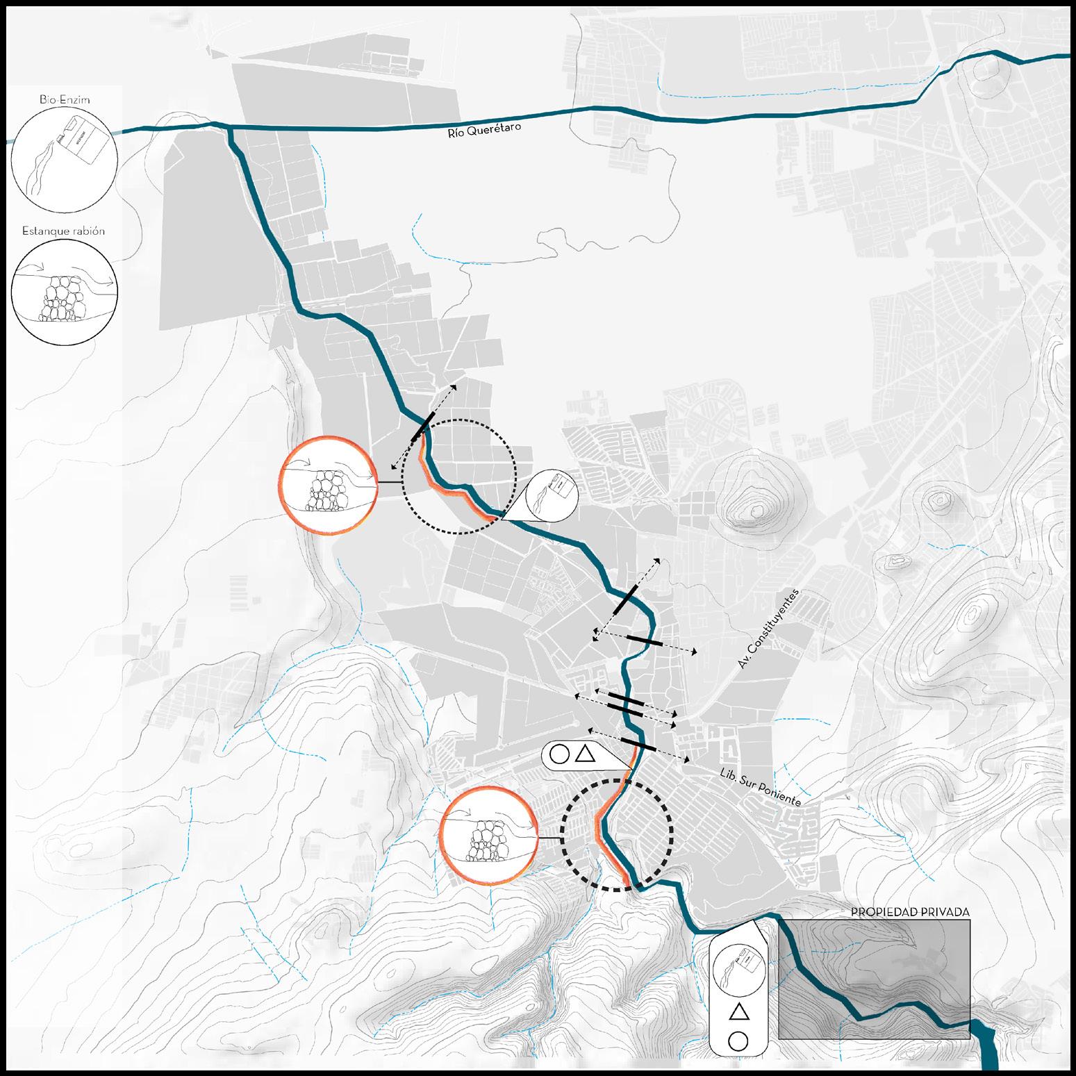 Se puede observar a nivel escala ciudad, dónde suceden las proble máticas en el río. En las zonas menos desarrolladas, hay asentamientos irregulares, los cuales son ilegales en todo México, ya que no debe ha ber ningún tipo de construcción 30 metros a los lados del cauce de los ríos. En estas zonas hay vertederos del drenaje y del rastro municipal; algunos sin ningún tipo de saneamiento. Otra problemática sucede en el centro del Pueblito, donde se rectificaron los taludes del río con muros de mampostería.