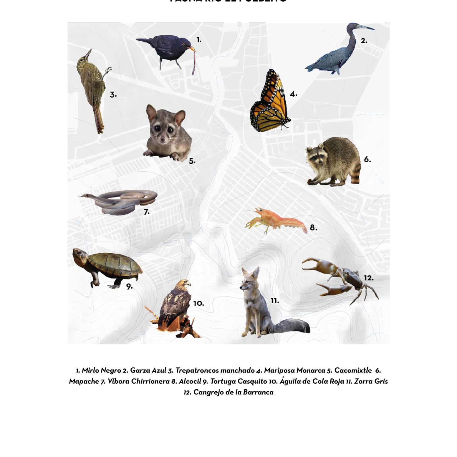 Gráfico: Corte ilustrativo de la flora y fauna del río el Pueblito. Elaboración propia.