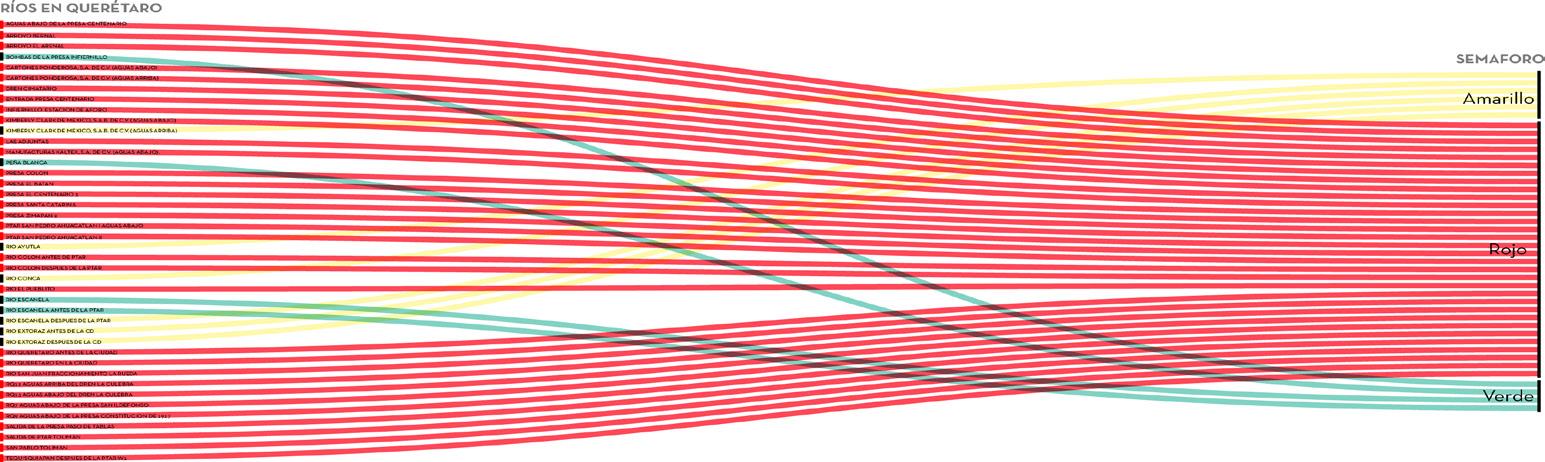 La CONAGUA lleva un monitoreo anual de los 42 cuerpos de agua en el estado de Querétaro. 32 de los 42 se encuentran hoy en día en semáforo rojo, como se puede observar en la gráfica. Río el Pueblito es uno de los 42.