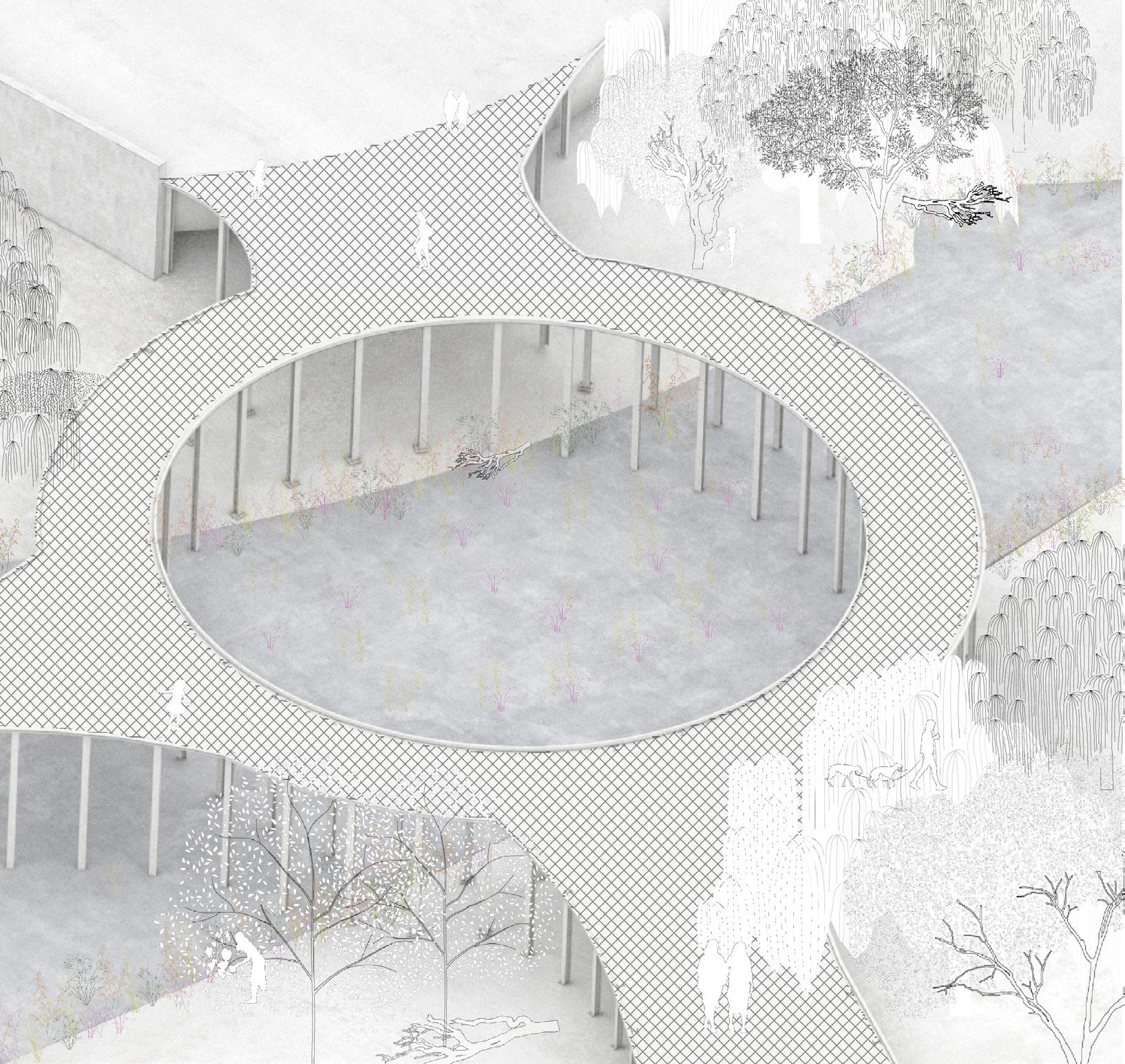 147 VISTA AXONOMÉTRICA TALLERES Y CAMINO DE REJILLA