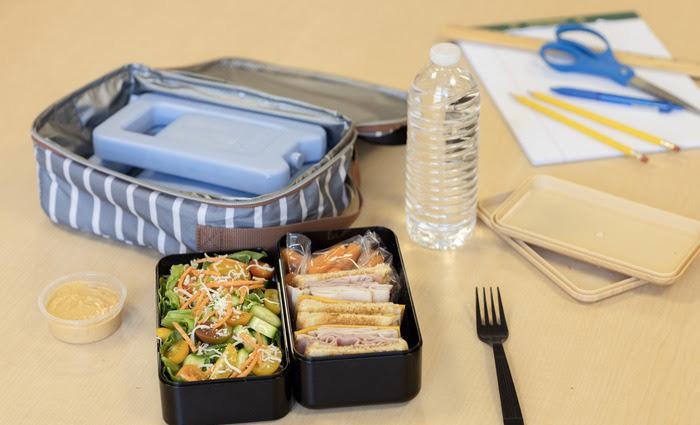 For cold lunches, use a soft-sided lunch bag and include at least two cold sources. You can use two frozen gel packs (not smaller than 5x3 inches each) or combine a frozen gel pack with a frozen juice box or frozen bottle of water. Place cold sources on top and bottom of the perishable
