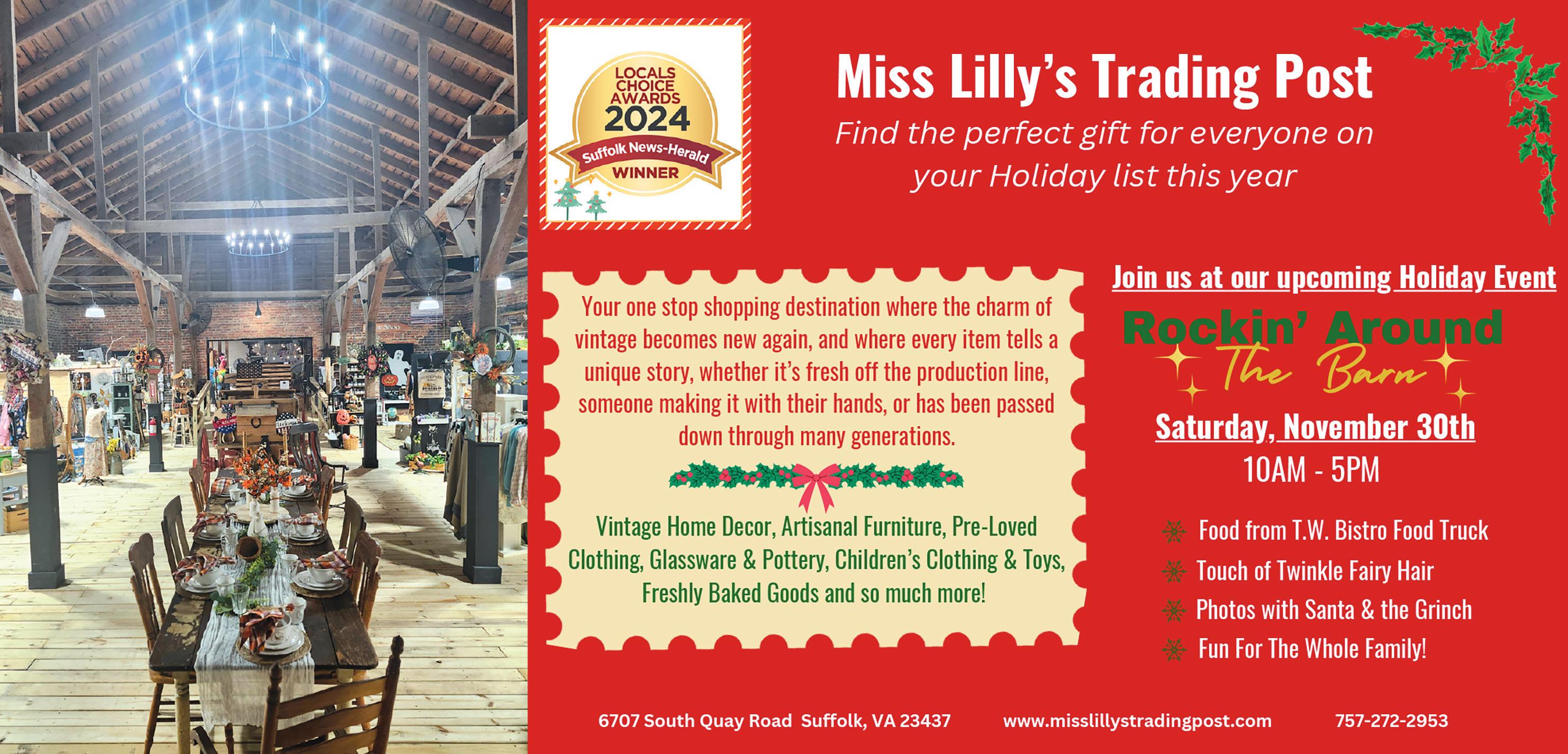 December 1 and 15 from noon to 4 p.m. 60+ local vendors and makers; Santa Claus; campfire; hot coffee, cocoa and tea; hot dogs, chips and drinks; the Grinch and more!