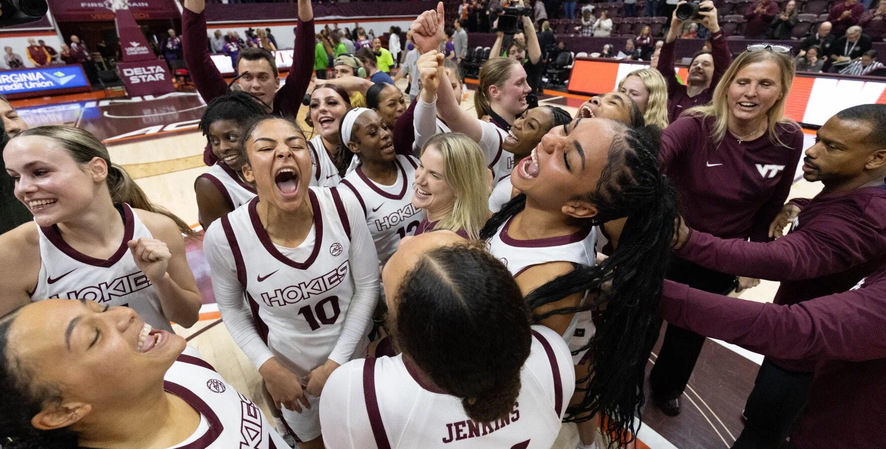 The Virginia Tech Hokies Women’s Basketball team celebrates on the court after securing a nail-biting victory in Cassell Coliseum.