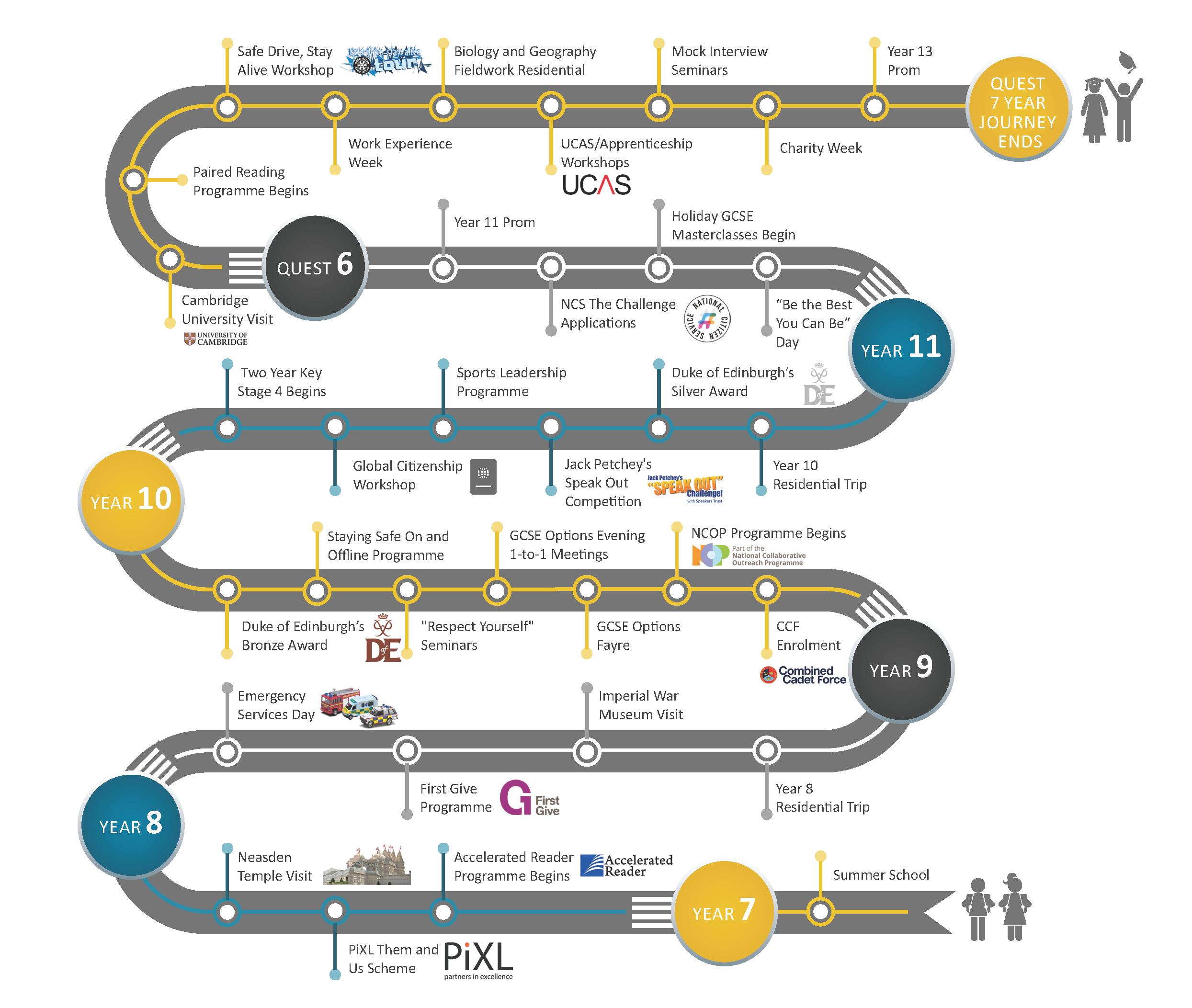 The Quest Academy’s 7 Year Journey is a unique and diverse range of quality additional activities that students enjoy during their secondary career at The Quest Academy so that they can develop the skills and experiences to lead successful and fulfilling adult lives.