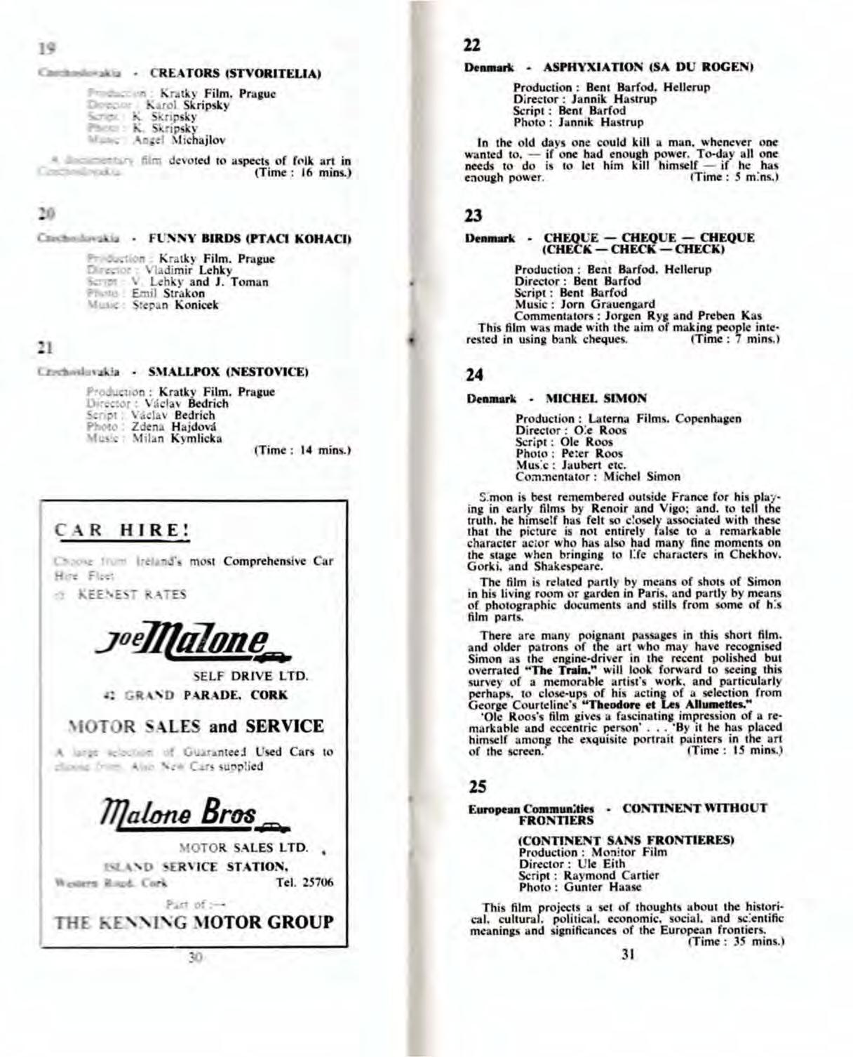 And t L nd n in Jul Derm f briefca e bulging with leue of introduction. With the exception of. trangel enough, one lri hman. all who were appr ached recci ed Dermot with ·ympathetic interest and a willingncs to give what istaoce they could . And m t important. Sir Henr L. French. then Pre ident of the Briti h Film Producers' A ociation. after a grea t deal f pre ure and a good amoun1 f 'blarney.· a ured Dermot that he would peak in fa our of Cork' application at the meeting in Wa hi.ngton Back again in Cork. ork ·tarted n the application itself. One item that aused ome di u. ' ion wa a tatement concerning "'the purp ·e f the fe ·tival." W ga thi deep th ught, and finally cam up itb the grandiloquent th me To ho that film wa the mo t powerful an form f the t cntieth centu " Th applicati n was finalised. and ent off to the Federati n. There wa no more we could d but wait. I my elf wa man mile · a~ a from Cork in vember when I g t a telegram from Dermot that contained but one word Succe We Learnt later that ome ixty citie had applied for fe tival in 1955. and that the Pre ident of the Fed ration was imp" d b the detail of Derm t' application that he pre ailed on the a embl to n minatc rk a one f th ix citie that w uld be permitted t tage a film fe ti al officiall apan from the aJrcad e tabli hed fe tival in Canoe , Berlin. etc.
