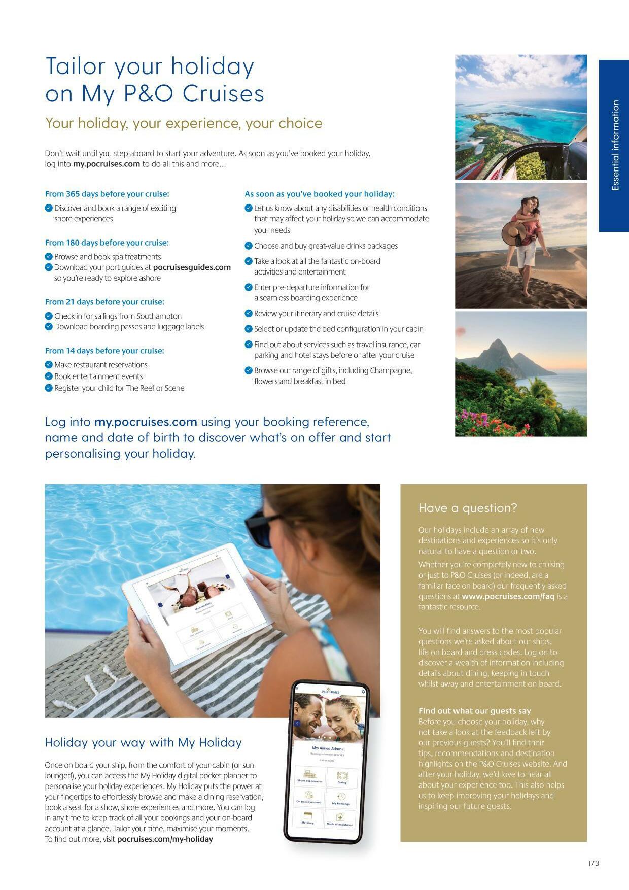 102 60 142 116 Choose your destination Fly-cruises 34 Canary Islands fly-cruises 36 Mediterranean fly-cruises 50 Caribbean fly-cruises 60 Sailing from Southampton 72 Short Breaks 74 Northern European City Escapes 82 British Isles 88 Norway & Iceland 92 Scandinavia & Baltic Sea 102 Spain, Por tugal & Canary Islands 108 Mediterranean 116 Caribbean 124 USA & Canada 130 Grand Tours 136 World Cruises 142 Exotic fly-cruises 150 Your ship What's on board 152 Deck plans 154 Still have questions? Essential information 172 Por t glossary 180 Cruise calendar 183 108 Contents 5