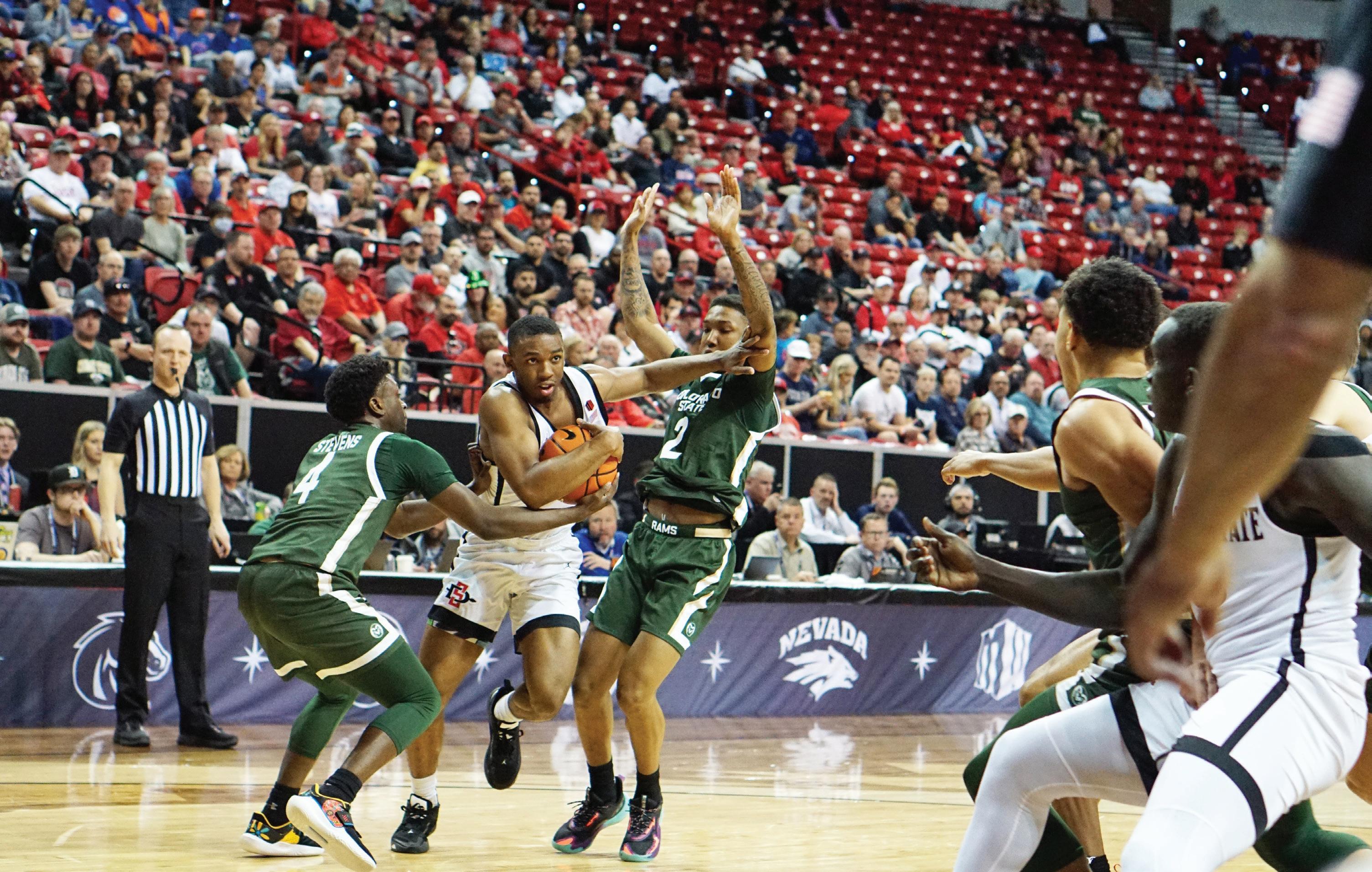 EDITOR: Justin Cox & Morgan Prickett sports@thedailyaztec.com Senior forwards Aguek Arop and Nathan Mensah share a hug during the Mountain West Championship Game on March 11, 2023. Photo by Huy Huynh Senior forward Keshad Johnson pulls up for a mid-range jumper against Colorado State University in the first round of the Mountain West Tournament on March 9, 2023. Photo by Huy Huynh Junior guard Lamont Butler drives through two Colorado State defenders in the Mountain West quarterfinals on March 9, 2023. Photo by Huy Huynh