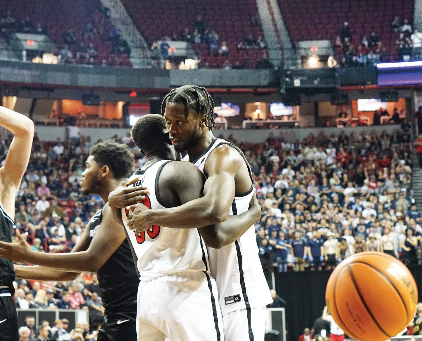 Both teams traded buckets as 1:45 elapsed in the start of second half before the Aztecs felt the need to bring back their spark, Arop. On his first offensive play he worked his way down low and pump faked a couple of times before floating in a layup.