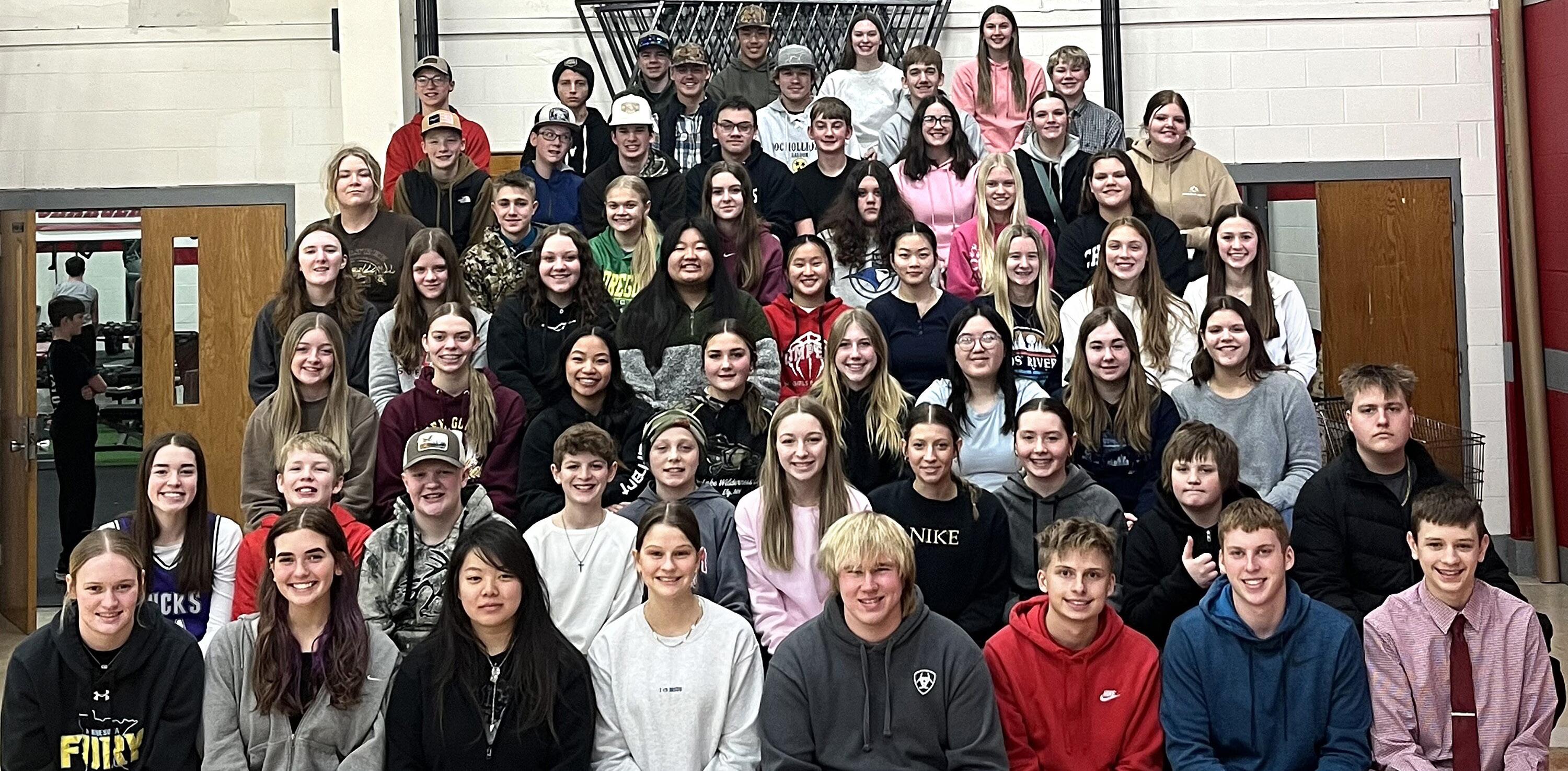 Heron Lake-Okabena FFA members include TJ Ostrem (front, from left), Addison Schumacher, MacKenzie Ehlers, Ellie Rasche, Emily Bartosh and Ashlyn Koch. Row 2: Ally Kilker, Lilly Bass, Jolyne Zimmerman, Addalie Heideman, Avryanna Heisler, Bailee Peil, Renae Salentiny, Ellie Freking, Kia Kolander, Jada Milbrath and Allison Santinzo Vacente. Row 3: Joelle Brunk, Lauryn Hendel, Erin Salentiny, Ashton Reierson, Samantha Krumbach, Katherine Krumbach, Austin Spielman, Lexi Haberman, Lydia Fest and Avery Janssen. Row 4: Colten Reierson, Cooper Fest, Karsen Leighty, Mason Haberman, Peyton Kilker, Kolten Sieben, Rodden Eidhammer, Trae Janssen, Jake Zuehlke and Dylan Zuehlke. Row 5: Evan Liepold, Ryker Peterson, Jameson Say, Nathan Madsen, Tyler Morphew, Shelby Milbrath, Caleb Eigenberg and Daniel Ruthenbeck.