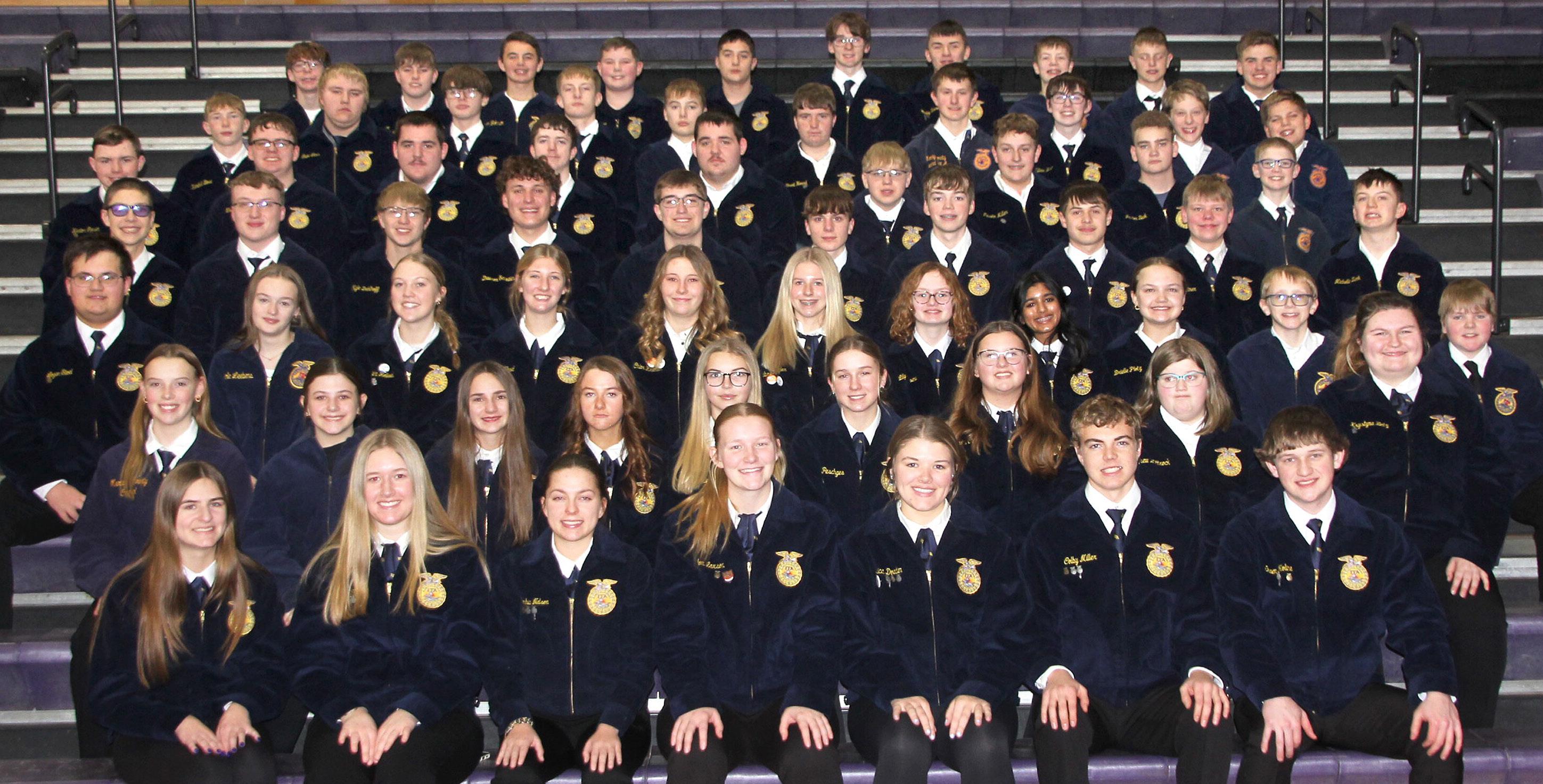 Contributed / Justin Lessman, Jackson County Pilot Members of the Jackson County Central FFA include Kylie Zishka (front, from left), Lilly Marshall, Caledon Lessman, Lily Johnson and Samantha Henning. Row 2: Thomas Bidne, Nayeli Ayers, Adria Ambrose, Aubrey Erickson, Miley VanDeVere, Julia Bidne, Jessica Dvorak, Paige Benda, Madison Censky and Zoey Hall. Row 3: Weston Rowe, Thomas Sether, Roman Voss, Ian Titterington, Ramsey Johnson, Paylin Sether, Violet Worthington, Delaney Krumwiede and Isabelle Henning. Row 4: Michael Hansen, Tanner Nelson, Riley Benda, Kallee Nelson, Milli Insichienmay, Katelyn Hendricks, Saige Theobald, Aralia Ruby, Grant Ambrose and Tressa Withers. Row 5: Elizabeth Rasmussen, Clara Brinks, Renae Vancura, Hilary Stai, Aliza Liepold, Bailey Finck, Raeleigh Hill, Abigail Mohr, Alyse Thurmer, Emma Gillum, Hadleigh Nosbusch. Row 6: Carson Kolander, Jamie Edlin, Rachel Mohr, Kayleigh Nosbusch, Joshua Thompson, Jack Hargan, Hunter Hanson, Drake Grein, Cael Entriken, McKade Tewes and Issabella Howard. Row 7: Kayden Eller, Ryan Burgoyne, Jacob Cihak, Alex Mohning, Nicholas Haley, Landon Baldwin, Brock Berkner, Levi Thompson, Landon Carter and Nadia Worthington. Row 8: Kash Gilbert, Evan Pohlman, Gavin Tusa, Dalton Wilking, Holden Stumpf, Brodie Pavelko, Caleb Nelson, Rose Tusa, Danica Wood and Erin Beckel.