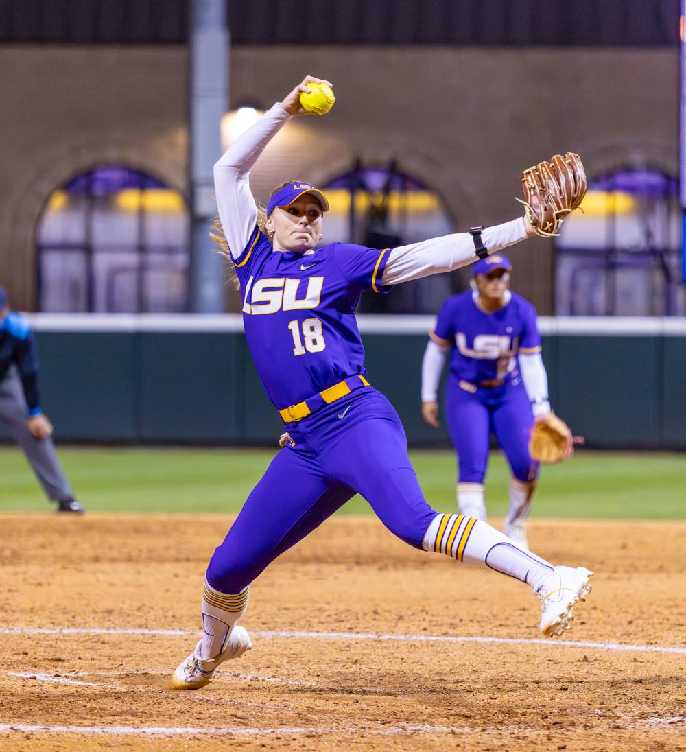 LSU softball fifth-year senior pitcher Tatum Clopton (18) pitches the ball during LSU’s 7-5 win against NC State on Feb. 6 at Tiger Park in Baton Rouge, La.