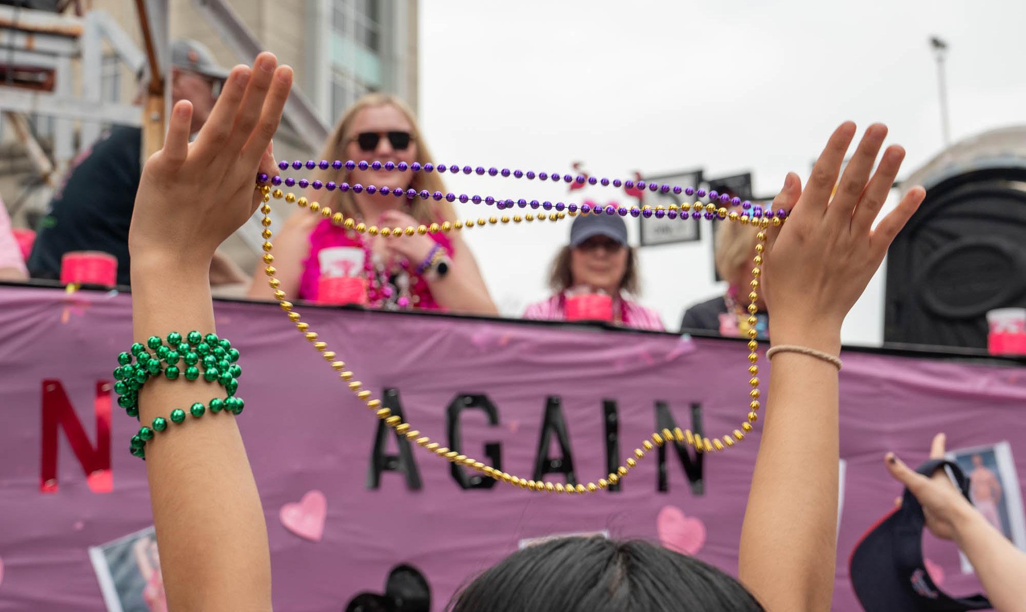 Lisa Mahoney, LSU’s Campus Sustainability manager, explained that her department gives all of the donated beads and throws to The Arc of Louisiana, an organization that em -