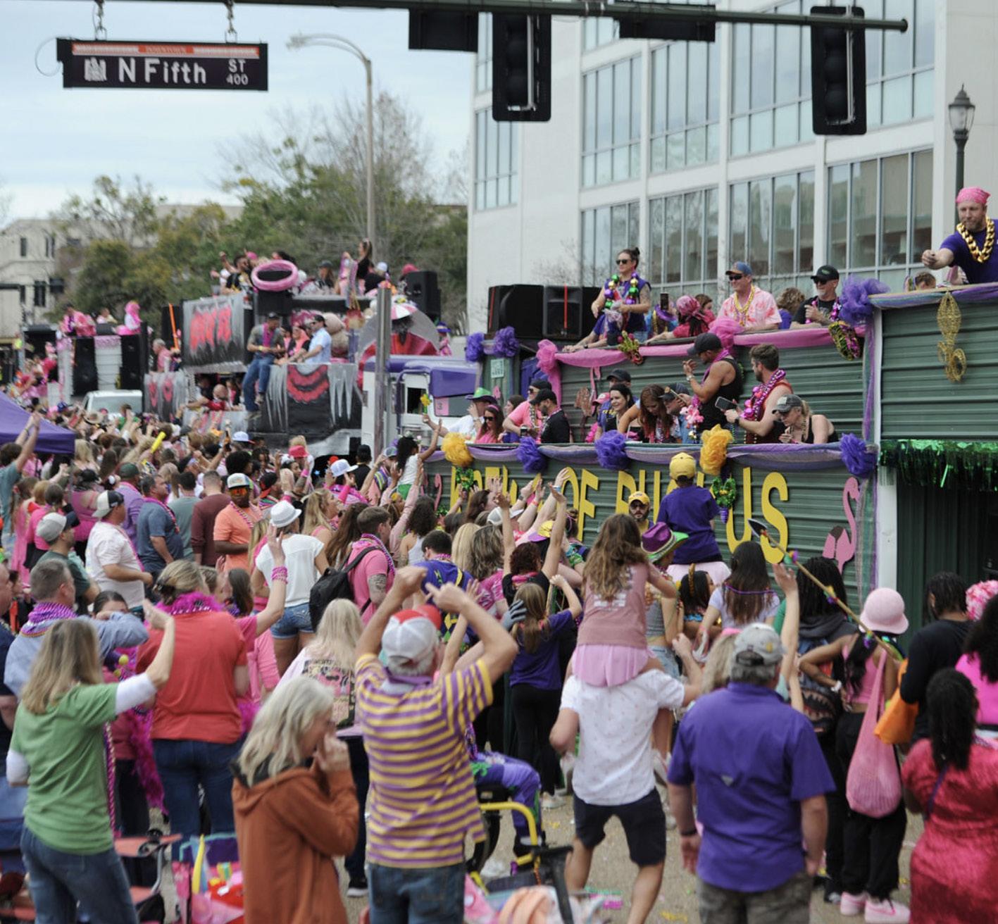 The Krewe begins lining up around 9 a.m on the day of the parade and welcomes people to come by for a close up look of the floats. The parade always begins at noon and starts the route on Spanish Town Road, heading to Ninth, North, Fourth, Main, Ninth, Laurel, Fourth, Florida, Seventh to Convention streets and River Road, ending at North Street.