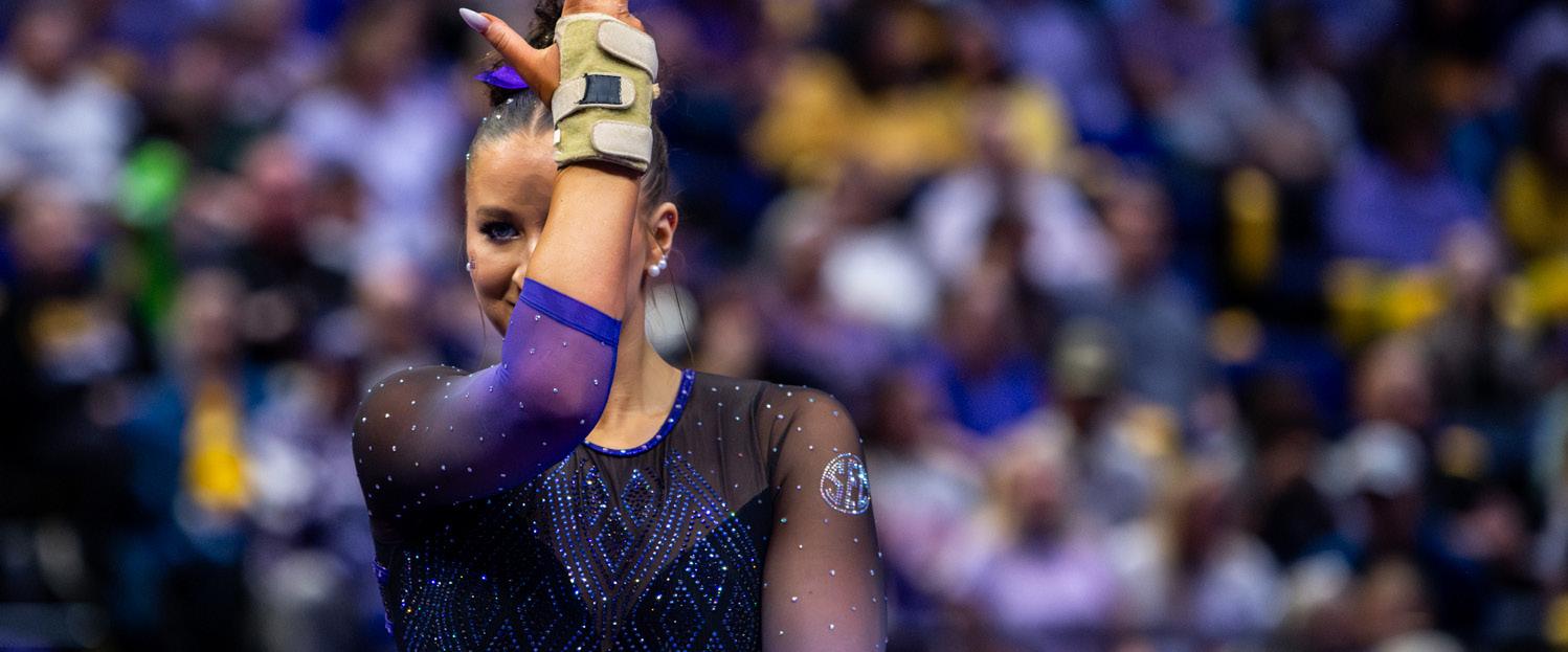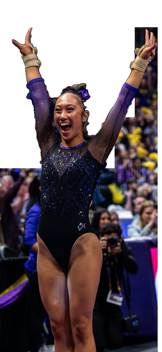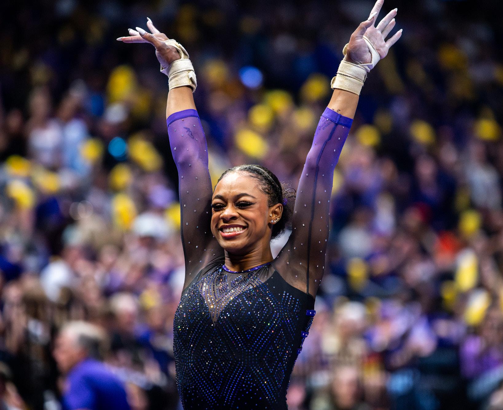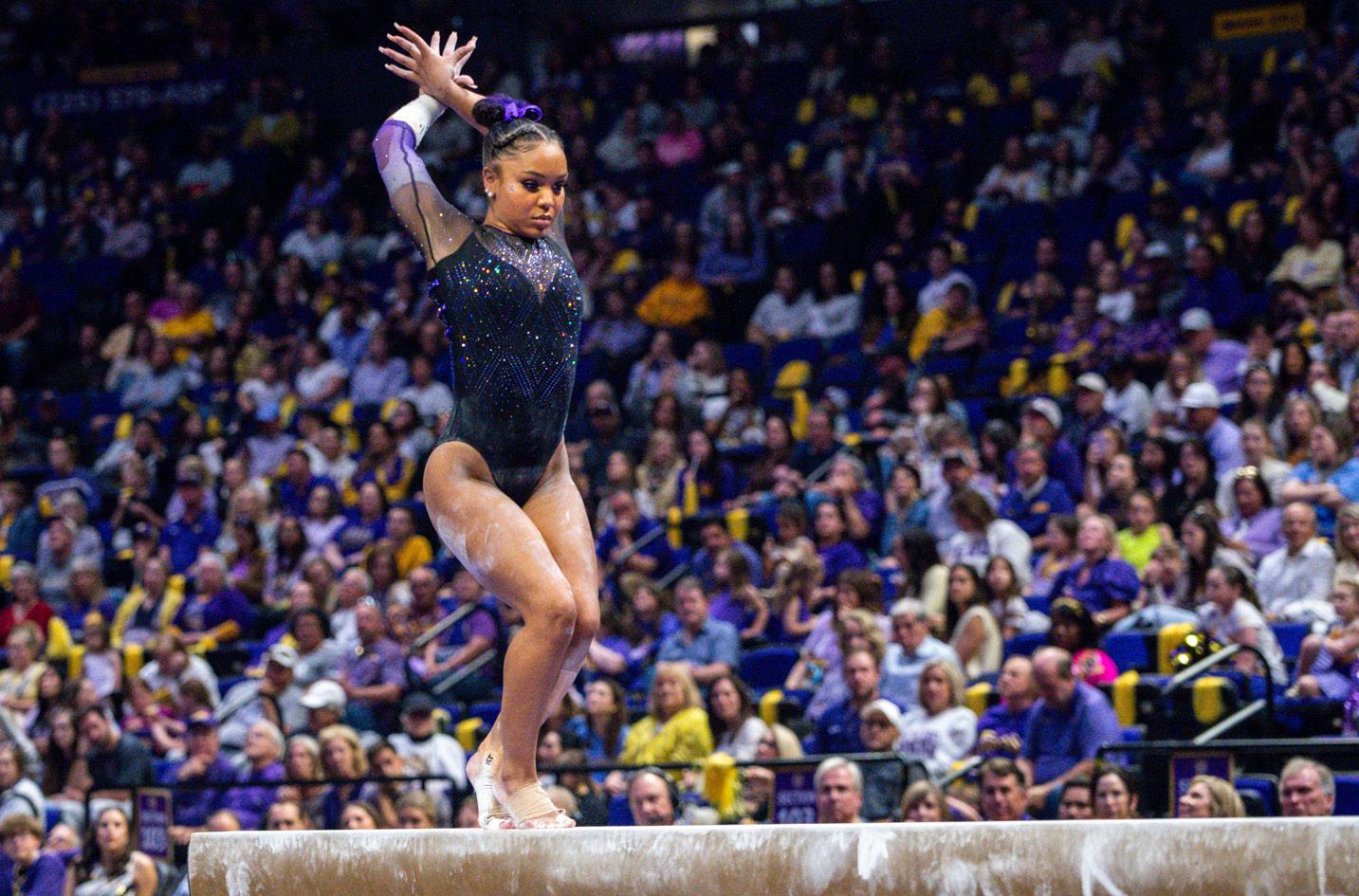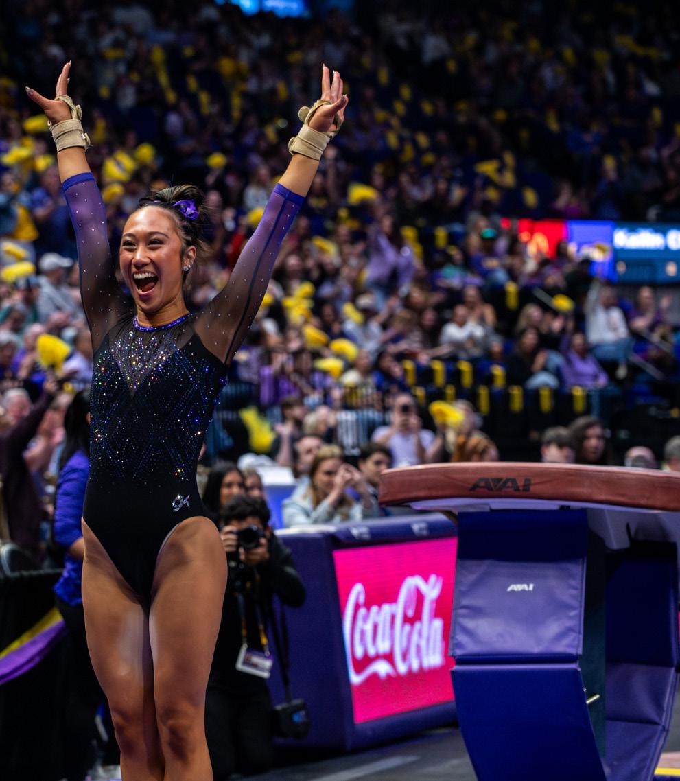 While Chio reached perfection on the vault, balance beam and floor, Bryant saw her historic night at home against West Virginia on the vault, uneven bars and floor. Bryant’s performance marked a night to remember, and the 33-time All-American gymnast would go on to set the LSU record for the most perfect scores earned in one season the next season, with eight 10s to her name.