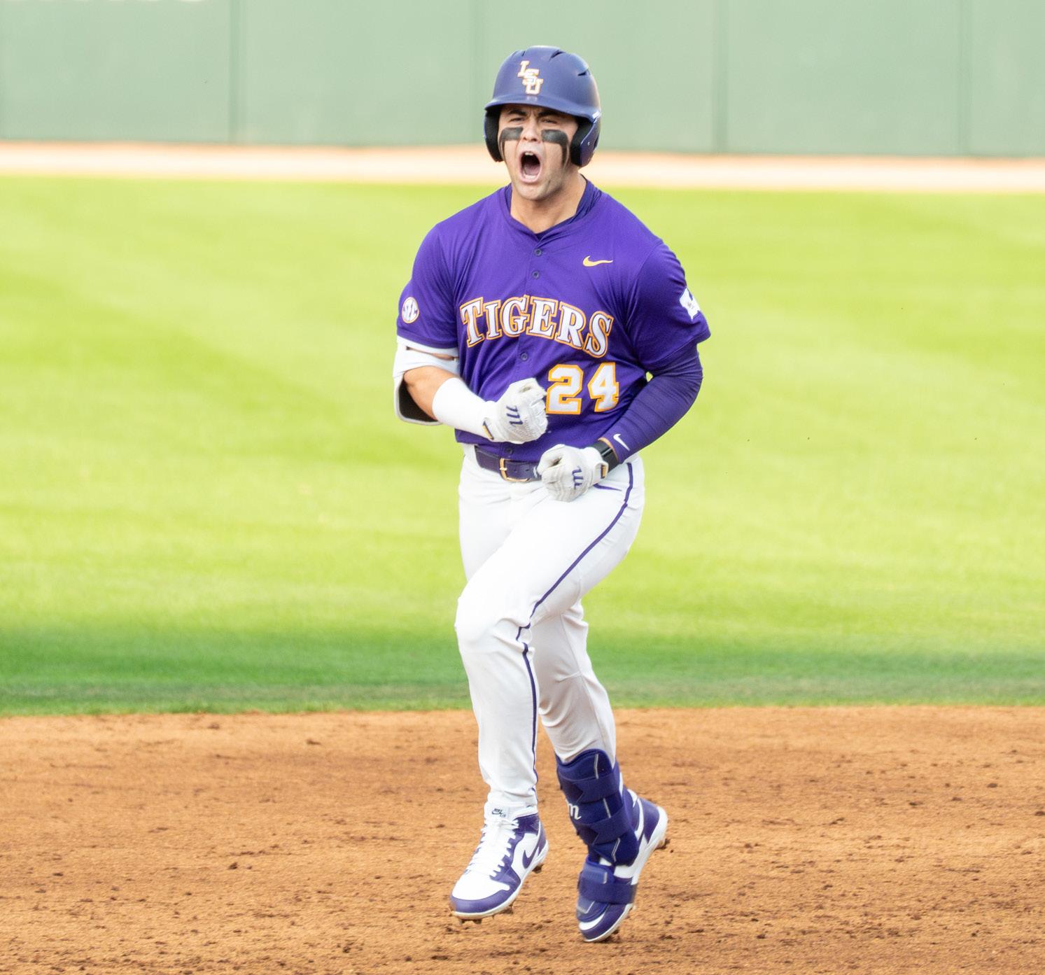 SAM BECKER / The Reveille LSU baseball 5th-year senior infielder Seth Dardar (24) celebrates during the Tigers’ 15-5 victory vs Milwaukee Feb. 13 at Alex Box Stadium.