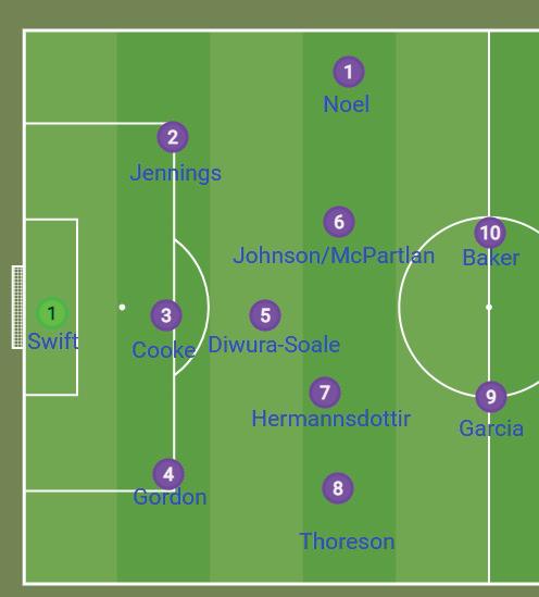 With this, most players con tinue to play the same role they would play in the 4-3-3. Noel is technically a wide midfielder, but she likes to get forward often from her fullback role creating that wide midfielder look. Her mannsdottir normally likes to play a sort of attacking midfielder role and this formation still allows for that. If the roles are identical, this makes changing the formation an easy halftime or mid-game switch.