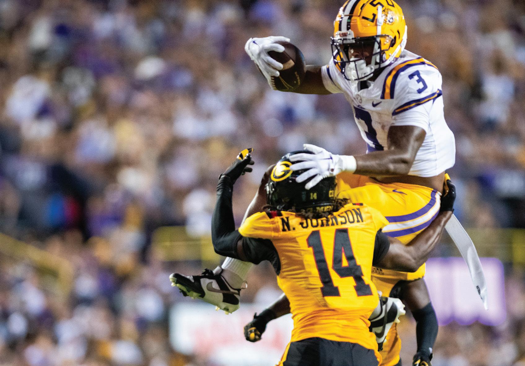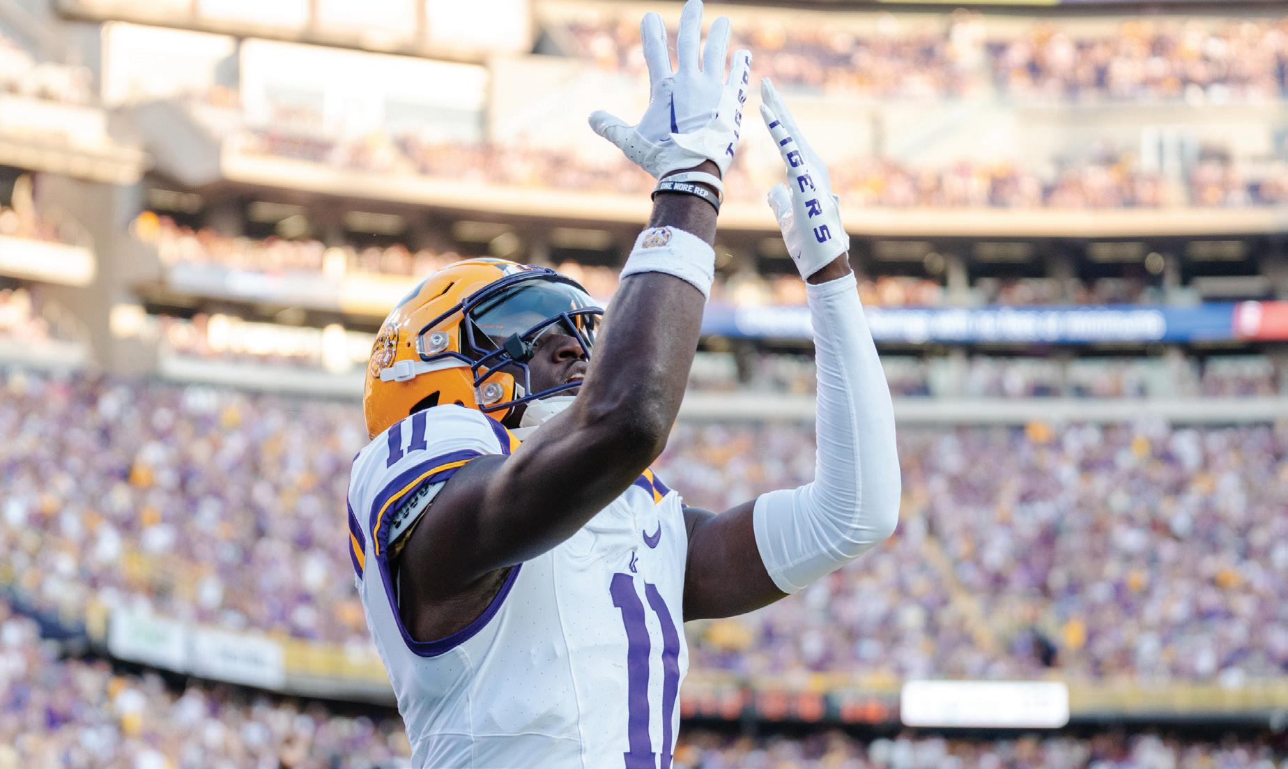 LSU football junior wide receiver Brian Thomas Jr. (11) catches a touchdown on Sept. 9 during LSU’s 72-10 win against Grambling in Tiger Stadium in Baton Rouge, La.
