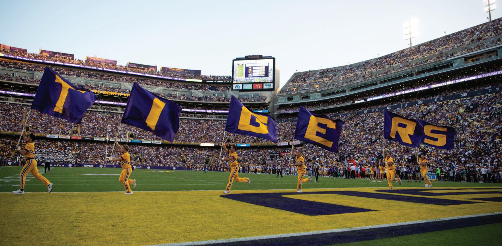 The LSU cheerleaders run through the endzone with flags after a touchdown on Sept. 9 during LSU football’s 72-10 win over Grambling State at Tiger Stadium in Baton Rouge, La.