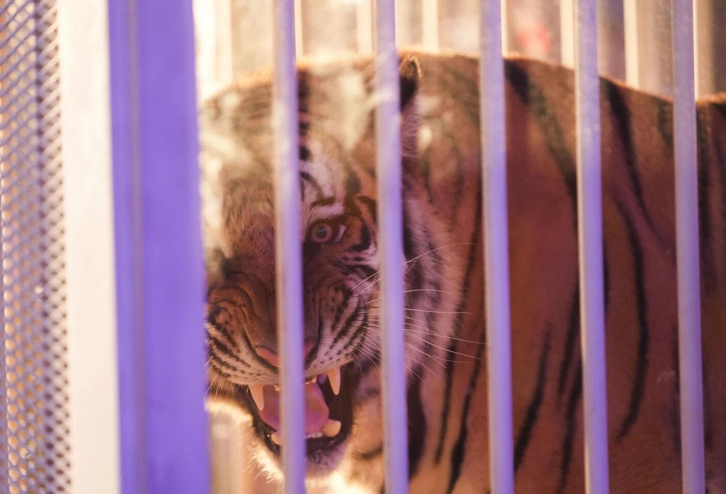 ing the university’s fight song, the tiger was wheeled out in a cage that was attached to a purple and gold truck.