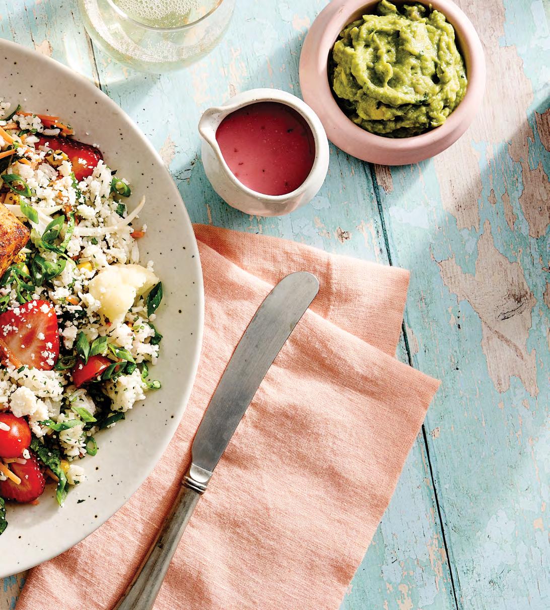 In a bowl add cooked jasmine rice, chiffonade of romaine, cilantro, roasted vegetable and corn mixture, tomatoes, shredded carrots, cauliflower, strawberries, and shave yellow onion. Pour in raspberry vinaigrette mixture and toss to coat. Place in a pasta bowl sprinkle with queso fresco crumbles and top with the dollop of guacamole.