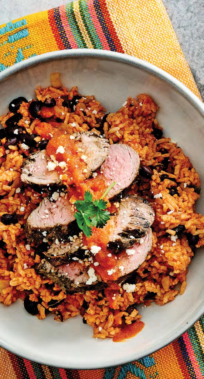 For this colorful fusion of Latin flavors, thinly sliced, fire-grilled Allegiance® Pork is settled on a heap of black bean and birria-infused jasmine rice. The fork-tender Duroc pork is seasoned with a Magellan® Caribbean Jerk Seasoning — a thrilling blend of salt, spices, red pepper, and chives.