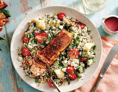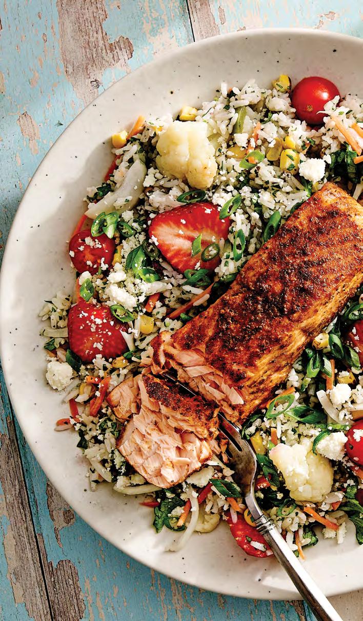 Rub this exquisite salmon with zesty Magellan® Cajun Seasoning before cooking. The fish will lay on a cornucopia of jasmine rice; tomatoes, carrots, cauliflower, and strawberries from Peak Fresh Produce®, among other veggies; and a Contigo® Southwest Fire Roasted Vegetable and Corn Blend. Add guac and queso fresco for cheesy, chunky Latin-inspired texture and color that complement the garden crunch.