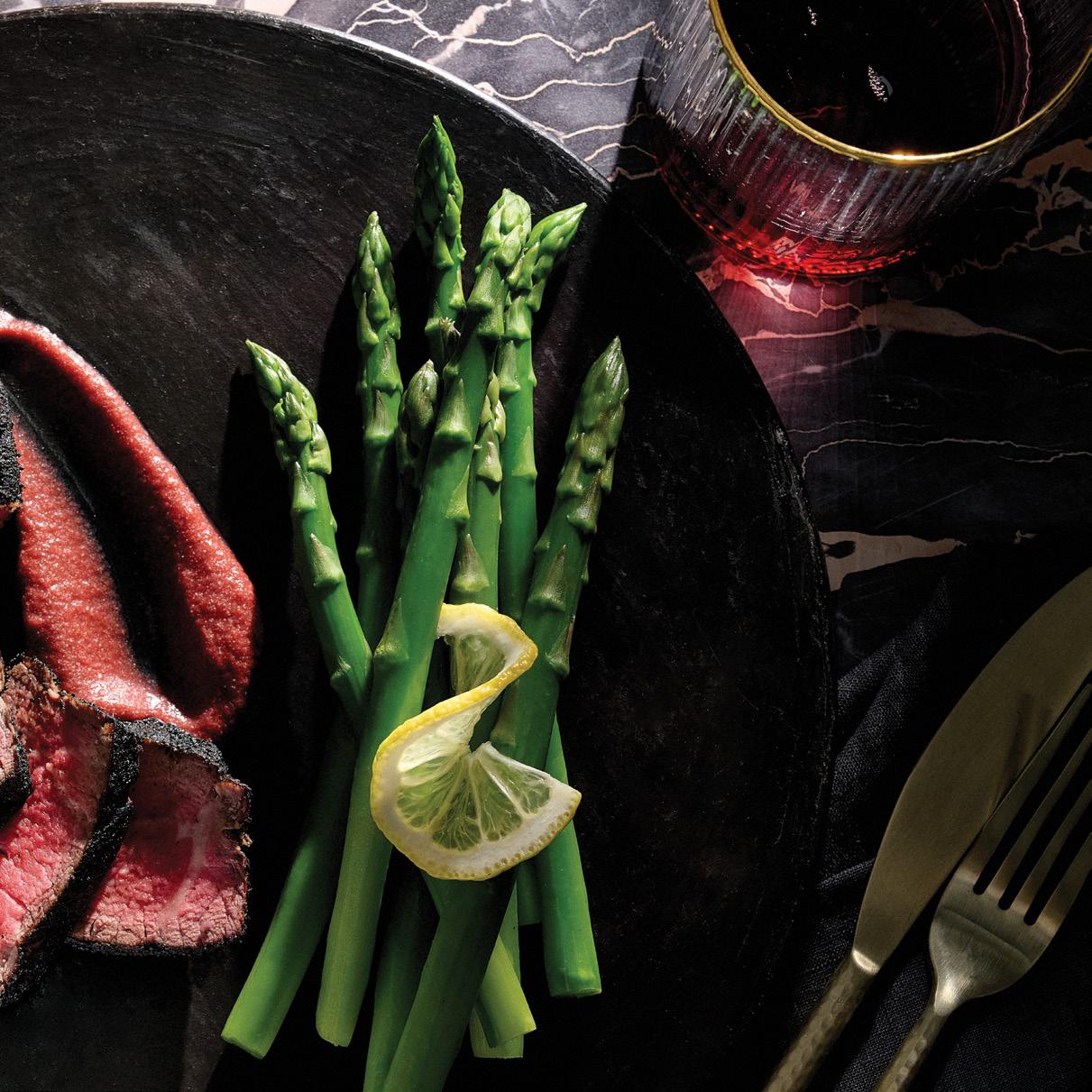 Here, we coat the spectacularly marbled meat with a roasty Coda Coffee rub, featuring hints of caramel — the beans grown in some of the world’s finest coffee hubs. Place the tenderloin on a striking, bold smear of Peak® Beet purée, alongside arboreal, asparagus confit. A dramatic port wine sauce is ready in minutes, brought to life with the addition of Braveheart Bone Broth, for a rich, elemental jus drizzled atop the meat.