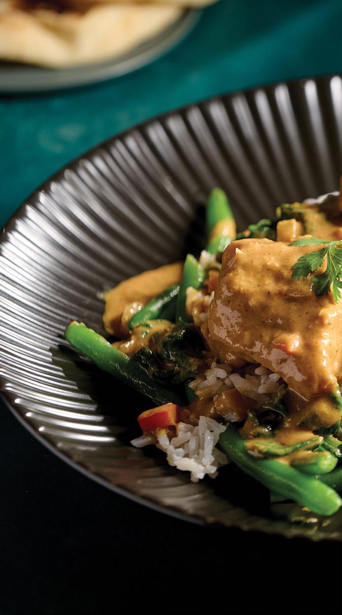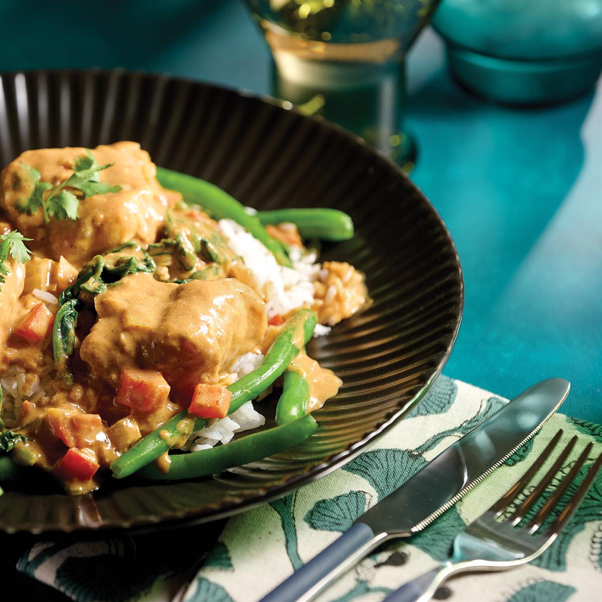 Monkfish’s mildly sweet flavor and texture is similar to lobster, with a high-protein, low-calorie count, and vitamin B12 for added energy. We simmered The Fresh Catch Monkfish Medallions in a spicy coconut curry sauce, with Heritage Ovens® Cornstarch and Asian Pride® Coconut Milk.