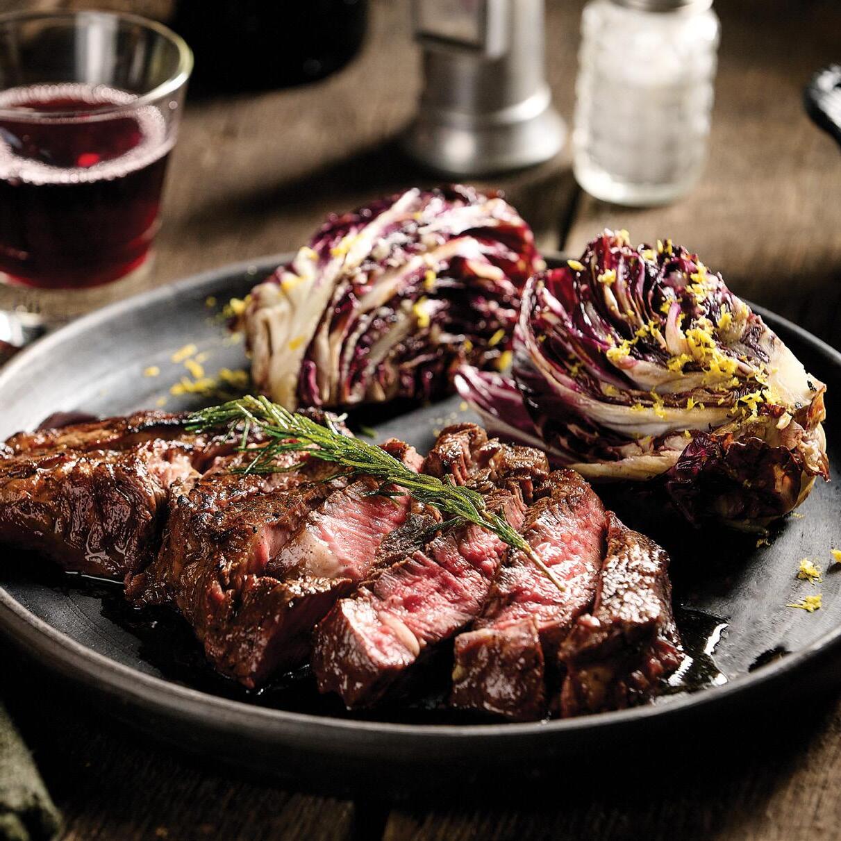 We’ve taken a hand-cut Surety Boneless Ribeye, brushed with rosemary-infused olive oil, and gently embraced it with flame, until it’s just slightly above rare. Then we arranged two orange-balsamic, charred Peak® Radicchio wedges alongside the beef.