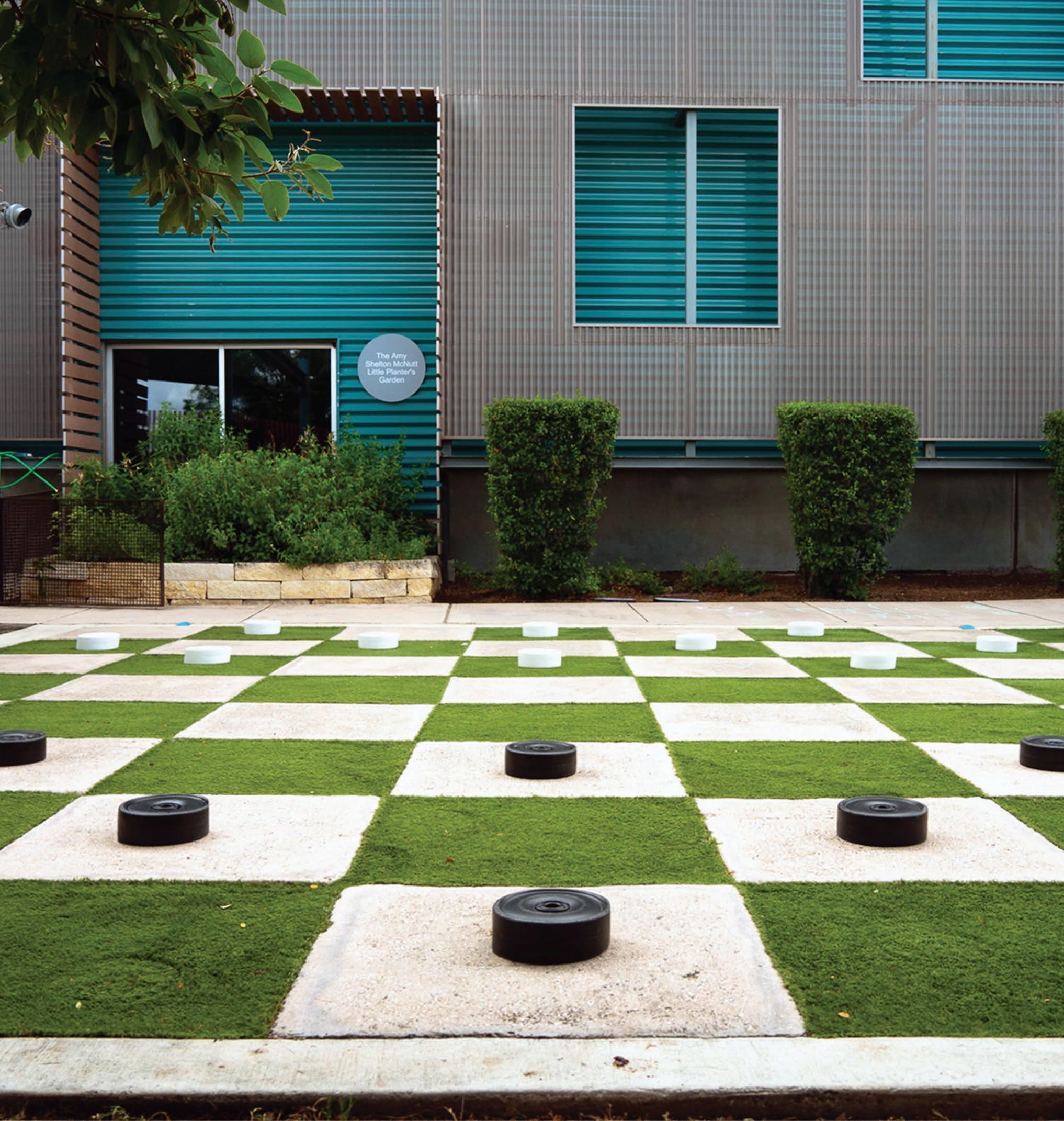 A life-size checkerboard can be found on the far side of The DoSeum’s West Yard. This space is used by families throughout the year to enjoy the outdoors and challenge each other to a friendly game of checkers and other outdoor lawn games.