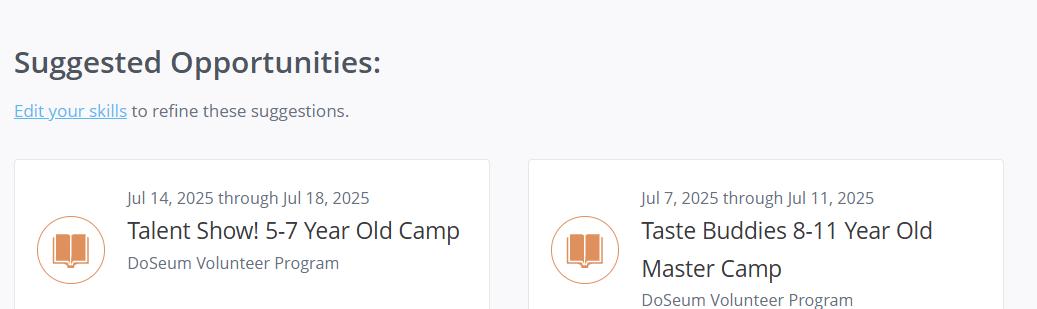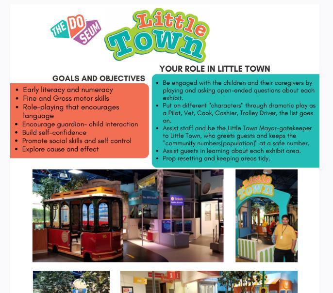 This screen will have a summary of The DoSeum, our mission and vision, and information along the right side of the screen. Scroll down on this page to see available shift opportunities specifically for the volunteer program. They are arranged by gallery/event such as Little Town Gallery Attendant or Birthday Party Attendant.