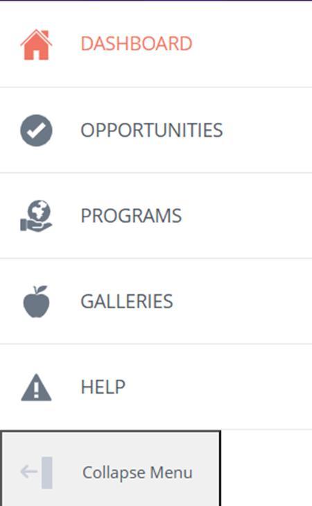 To navigate the site, you can see the different pages on the left side bar. Volunteers will see options for dashboard, opportunities, programs, galleries, help page, and to collapse the menu.