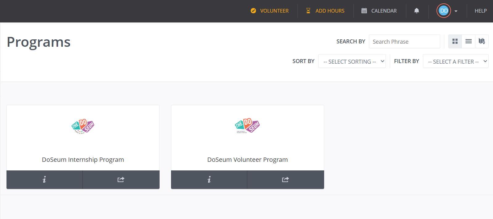 The Programs page shows the programs that The DoSeum offers. Click on the “DoSeum Volunteer Program” button to learn more about the program.