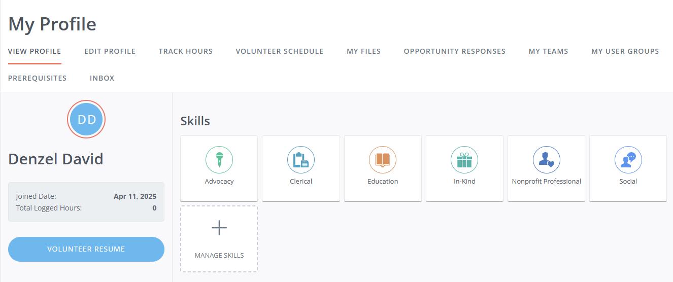 Volunteers can also use the “Volunteer Resume” button to download a PDF of your volunteer time from any date range. The resume will have hours served, number of shifts, skills used, and more.