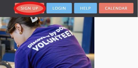 Using this link: https://thedoseum.galaxydigital.com/agency/ volunteers will land on the home page. On the top right of the screen, click on the “SIGN UP” button. (Circled in Red).