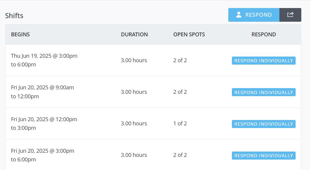 The opportunities page shows the available shifts you can sign up for. There are different types of shifts that are offered and can be seen on this page. It includes gallery attendants, birthday party attendants, camps, special events, and many more.