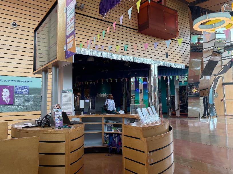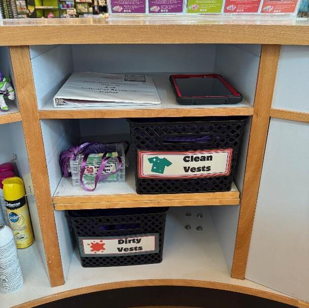 1. When you arrive at the DoSeum, you must check in at the Front Desk of The DoSeum. Make sure you are wearing your badge lanyard so the staff can acknowledge that you are a volunteer and that you are allowed to go behind the front desk. Please stop by the volunteer hub on the right side behind the Admissions team. Here you will find the Check In tablet, Check in binder, clean vests, extra volunteer badges, and the check in QR code. Please grab a purple vest to wear during your shift.
