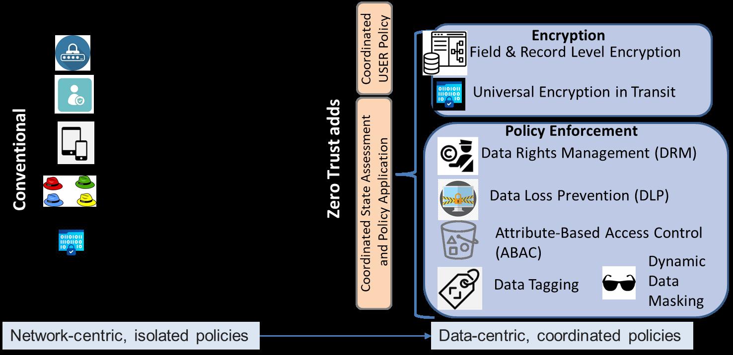 ZT end-user capabilities improve visibility, control, and risk analysis of infrastructure, application and data usage. This provides a secure environment for mission execution. Enabling ZT capabilities address the following issues and high-level goals: