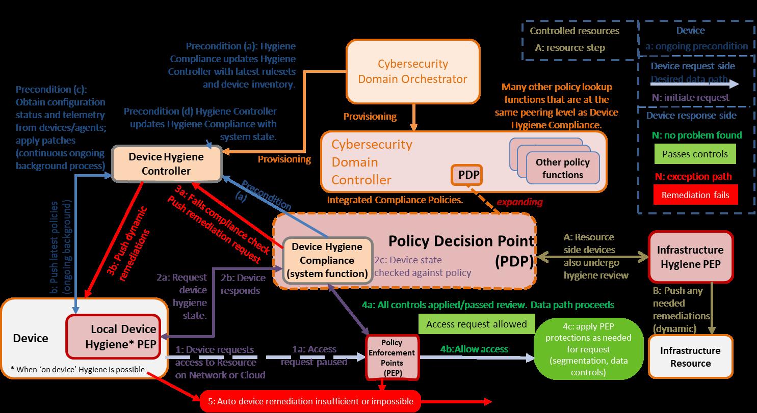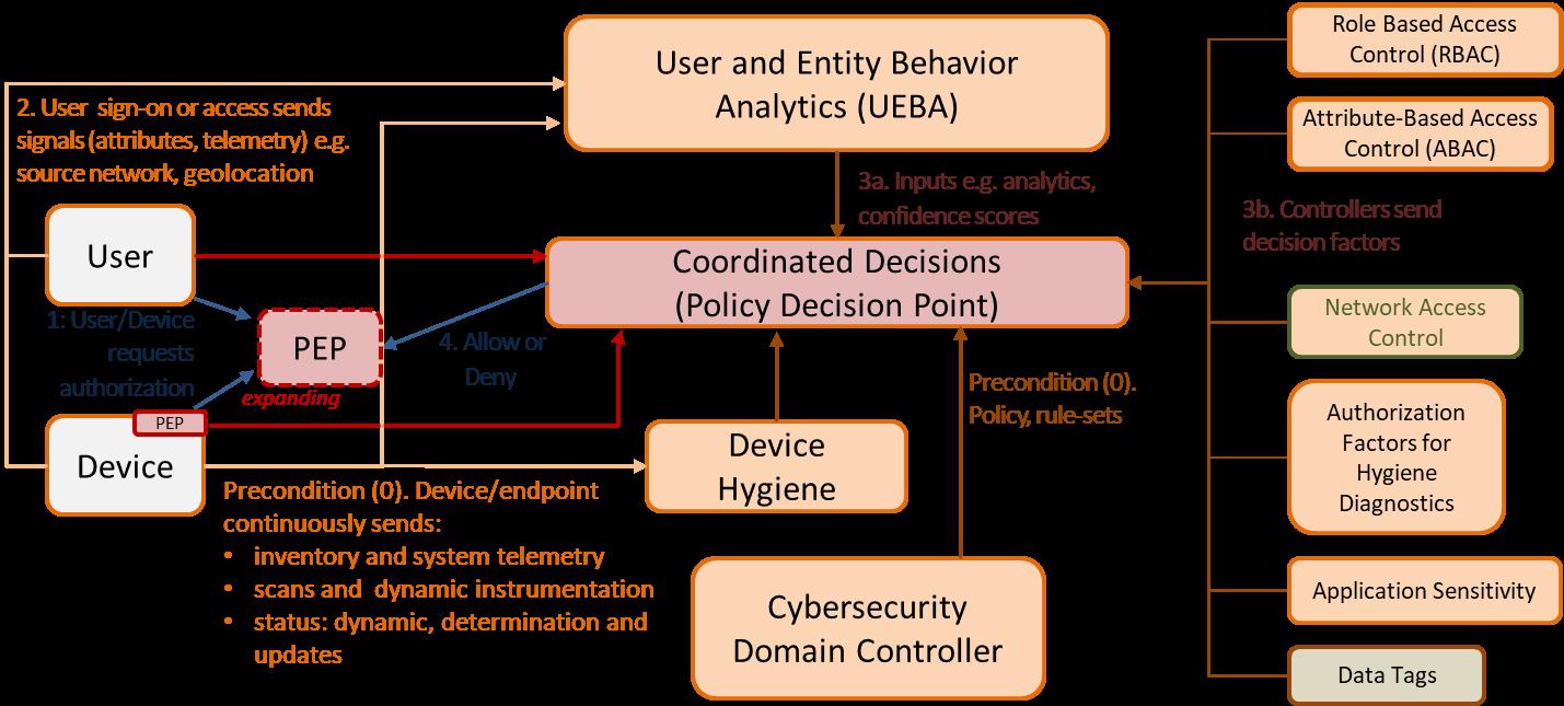 The ZT security policy is executed on numerous policy enforcement points throughout the architecture. The first steps in a flow from user to data are authenticating and authorizing a user which requires integration with an enterprise ICAM solution, global device management and continuous vetting of identity and attributes. The attributes required for authorization will be specific to the user's level of access, hygiene of the device, and activities performed in the environment. The combination of these elements develops into a confidence score which dynamically changes based on conditions and telemetry.