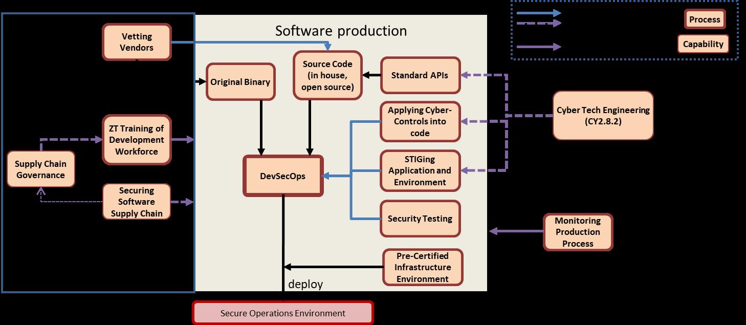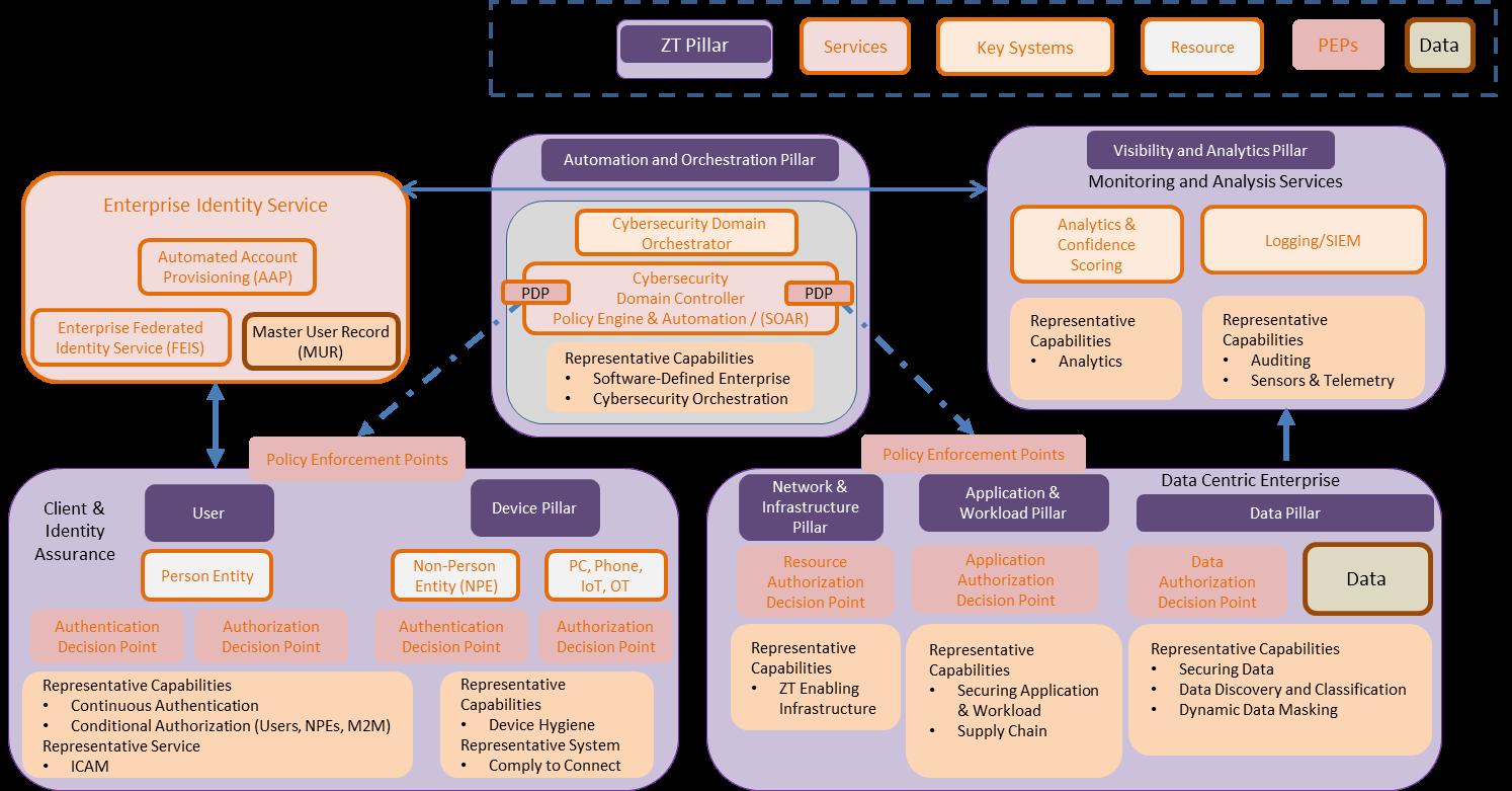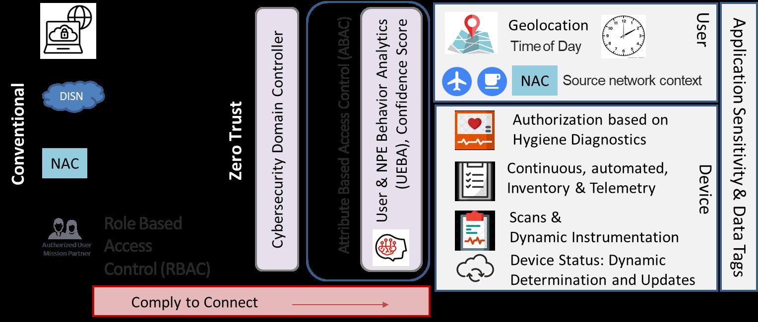 Beyond the issues identified above, there are existing capabilities within the enterprise which are key enablers for operationalizing ZT. Software defined enterprise (SDE) capabilities, such as automation, orchestration, and network function virtualization (NFV), combined with analytics for our defensive cyber operators enables the scale and confidence scoring necessary to achieve ZT security policies. Many of these capabilities have already been implemented throughout DoD and provide a great baseline for ZT when tuned with the proper configuration. NFV capabilities can also be rapidly deployed to protect legacy applications and enable resource authorization decisions for an enhanced security posture.