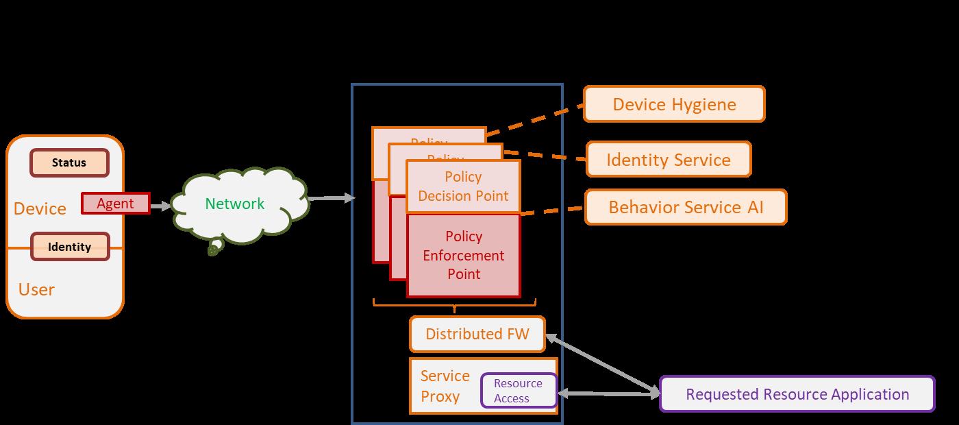 Virtual access points and gateways are the next phase in authorization A Policy Decision Point provides a confidence score of the user or endpoint. A Policy Enforcement Point then enforces segmentation policy and connects the user or endpoint to the requested resource. Depending on the implementation, certain cloud access points should align to the DoD Cloud Native Access Point Reference Design (CNAP RD). Within these access points are numerous security capabilities to include firewall and inspection technologies. Software defined perimeter capabilities also align to the requirements for implementing virtual access points.