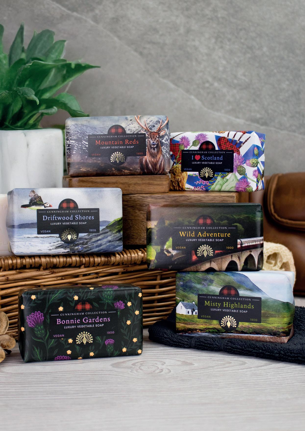 Our exquisite Cunningham Collection. Indulgent vegan soaps that honour the captivating essence of Scotland. Discover these six enchanting fragrances, thoughtfully encased in eco-friendly, fully recyclable packaging.