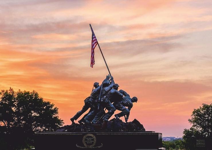 MarineCorpsWarMemorialisa nationalmemorialthatis dedicatedtoalltheUnitedStates MarineCorps(USMC)wholost theirliveswhileservingthe country.Thememorialhonorsall themartyrssince1775.Itis inspiredbyaniconicphotograph in1945.Thephotograph comprisedsixUSMCraisinga U.S.flagontopofMount SuribachiduringWorldWarII.