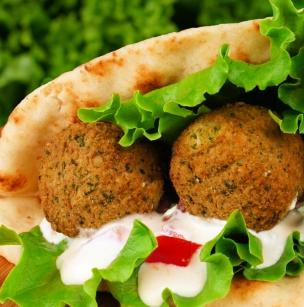 Deep-friedchickpeaballs,apopularstreetfood,are oftenservedonpitabreadwithfreshvegetables, tahini,andpickles.